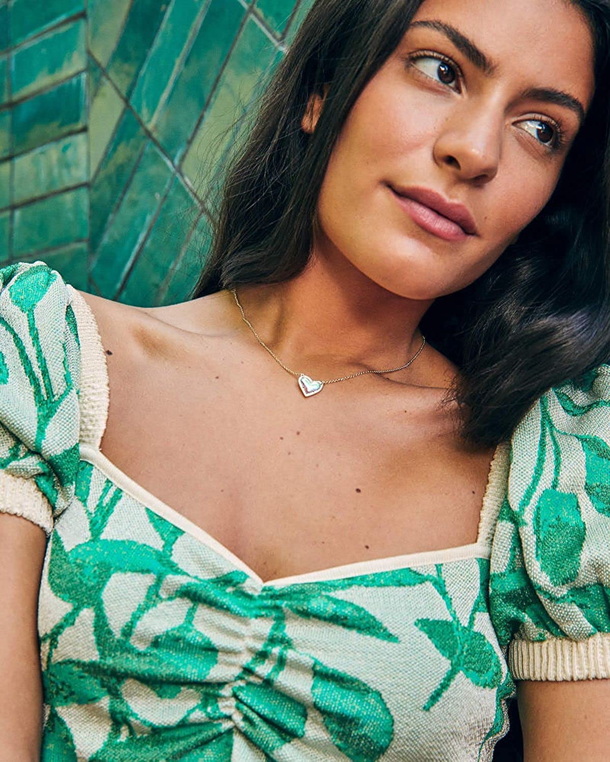 Manifest love in the Kendra Scott Ari Heart Short Pendant Necklace. Subtle necklaces features stone centers with etched edges. 14K gold, 14K rose gold, rhodium - all plated over brass. Lobster claw closure with extender. Imported.