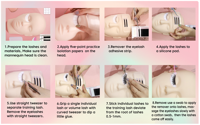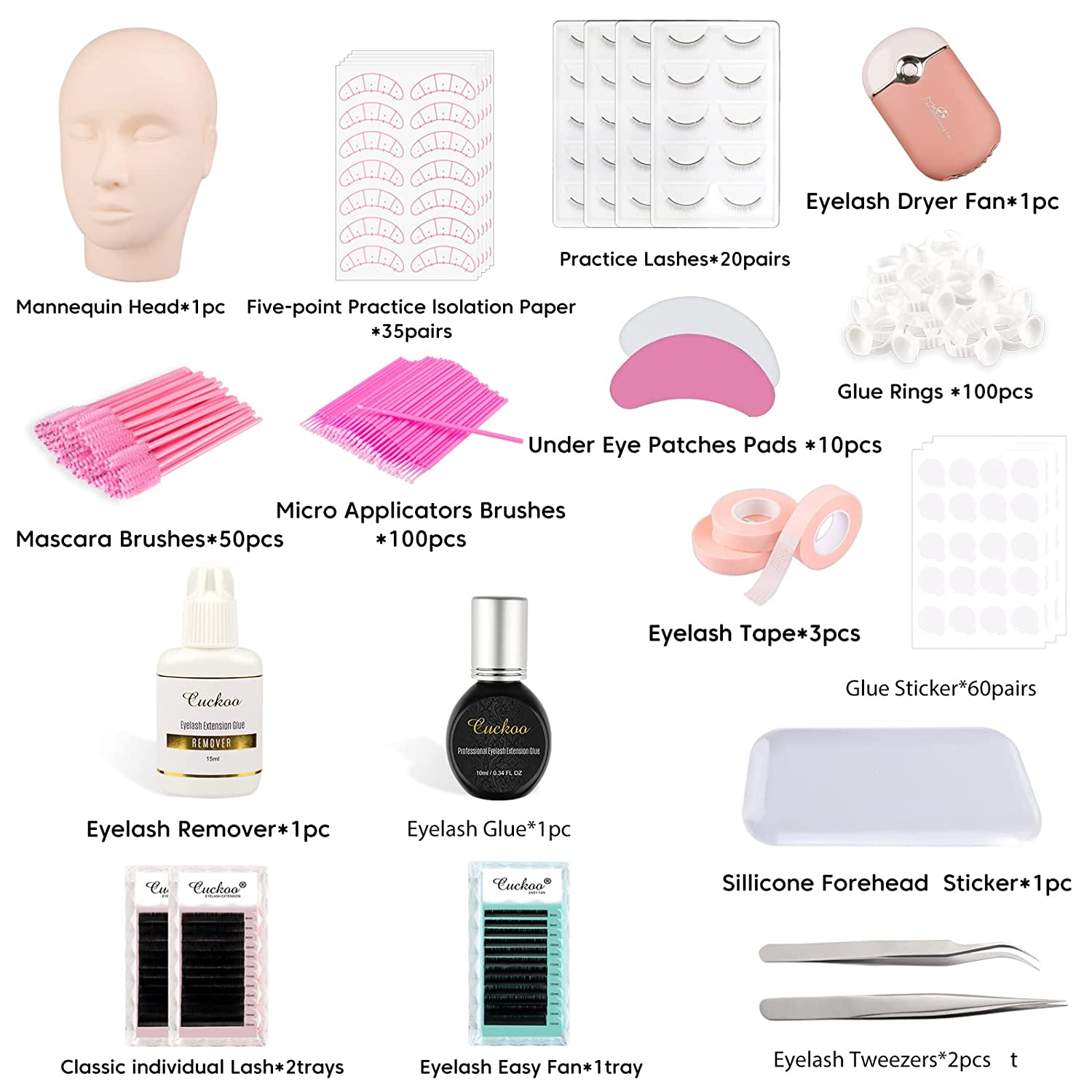 • Mannequin Head with Mannequin Head*1 PC,Classic Individual Lash*2 trays,Eyelash Easy Fan*1 tray,Practice Lashes*20 pairs,Eyelash Glue*1 PC,Eyelash Remover*1 PC,Eyelash Tweezers*2 PCS,Silicone Forehead Sticker*1 PC ,Glue Sticker*60 pairs,Five-point Practice Isolation Paper*35 pairs,Mascara Brushes*50 PCS,Micro Applicators Brushes*100 PCS,Glue Rings*100 PCS,Under Eye Patches Pads*10 PCS,Eyelash Tape*3 PCS,Eyelash Dryer Fan*1 PC.