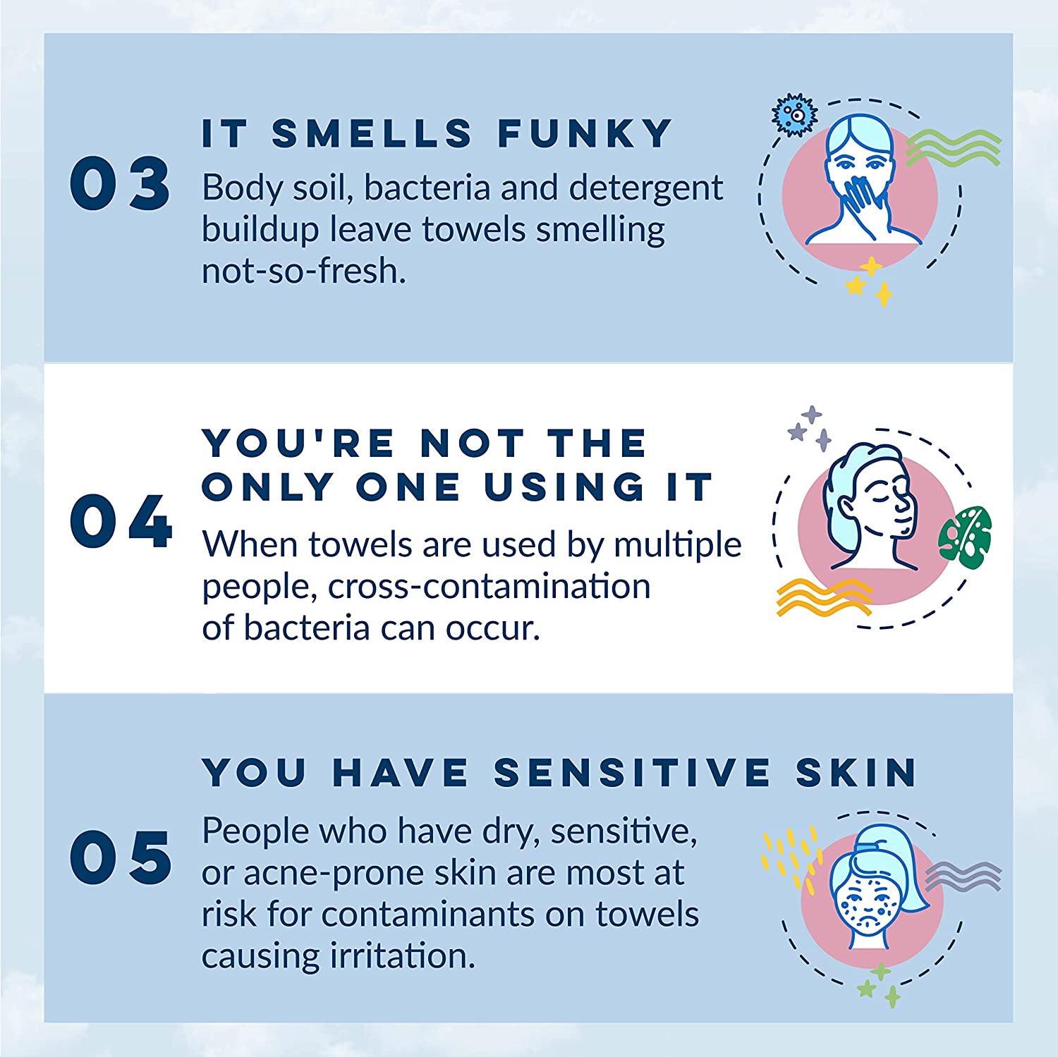 • ? SAY NO TO BACTERIA - Did you know that regular towels gather bacteria even after one use when left to dry? Standard towels also carry dead skin cells and can easily spread viruses.
