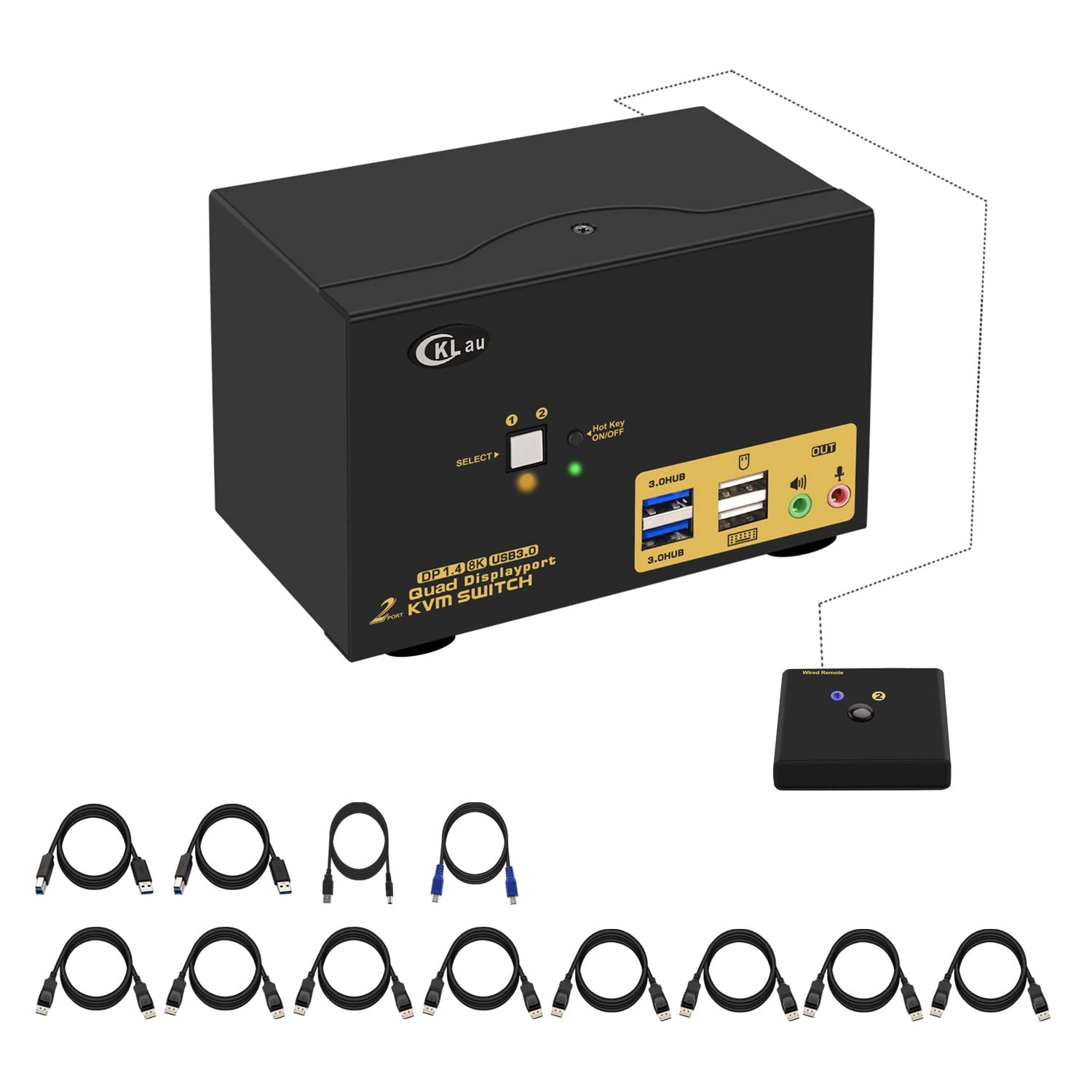 1. 2 Port KVM Switch Displayport 144Hz: 2 computers/laptops sharing one set of keyboard & mouse, 3 monitors, audio, microphone and 2 pcs USB 3.0 peripheral devices. It comes with audio and microphone output, 2 pcs USB 3.0 hub, a DC5V 2A power adapter, and all input cables. (Tips: 1. This KVM switch required each of your computers with 3 video outputs, otherwise, 3 monitors can't display together. 2. This KVM switch without simulation EDID function, windows maybe move after switching.)