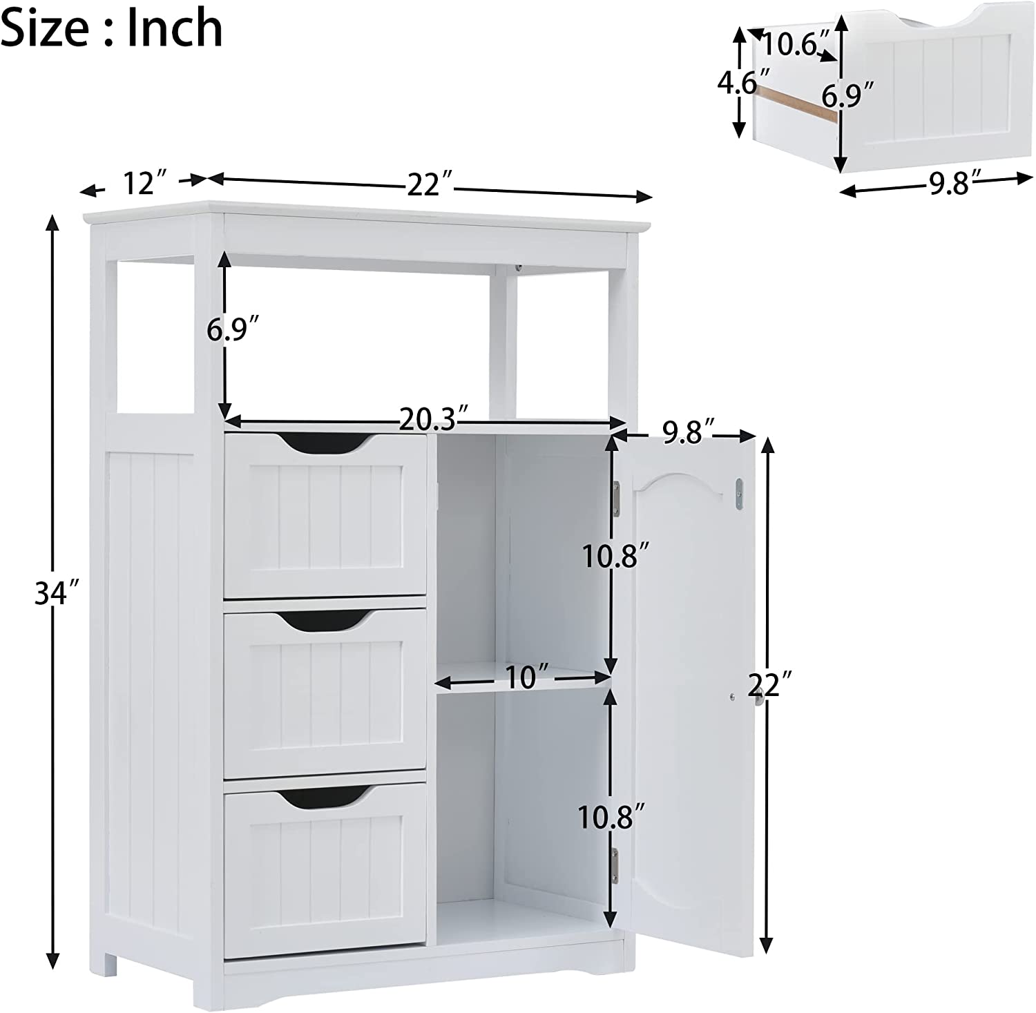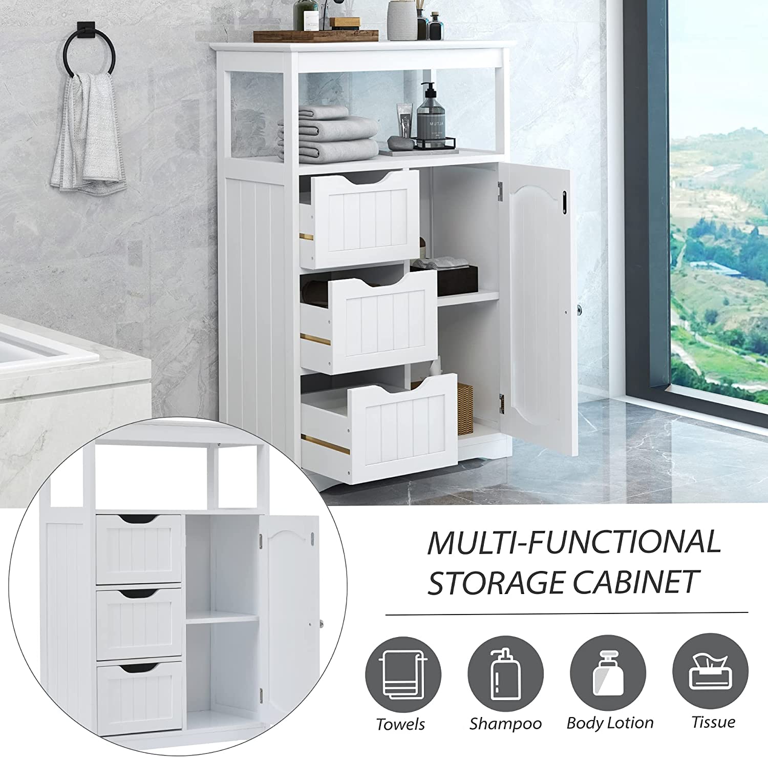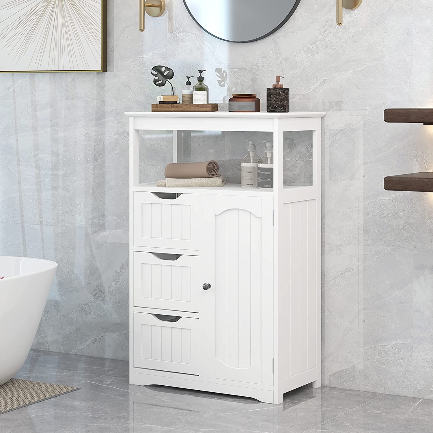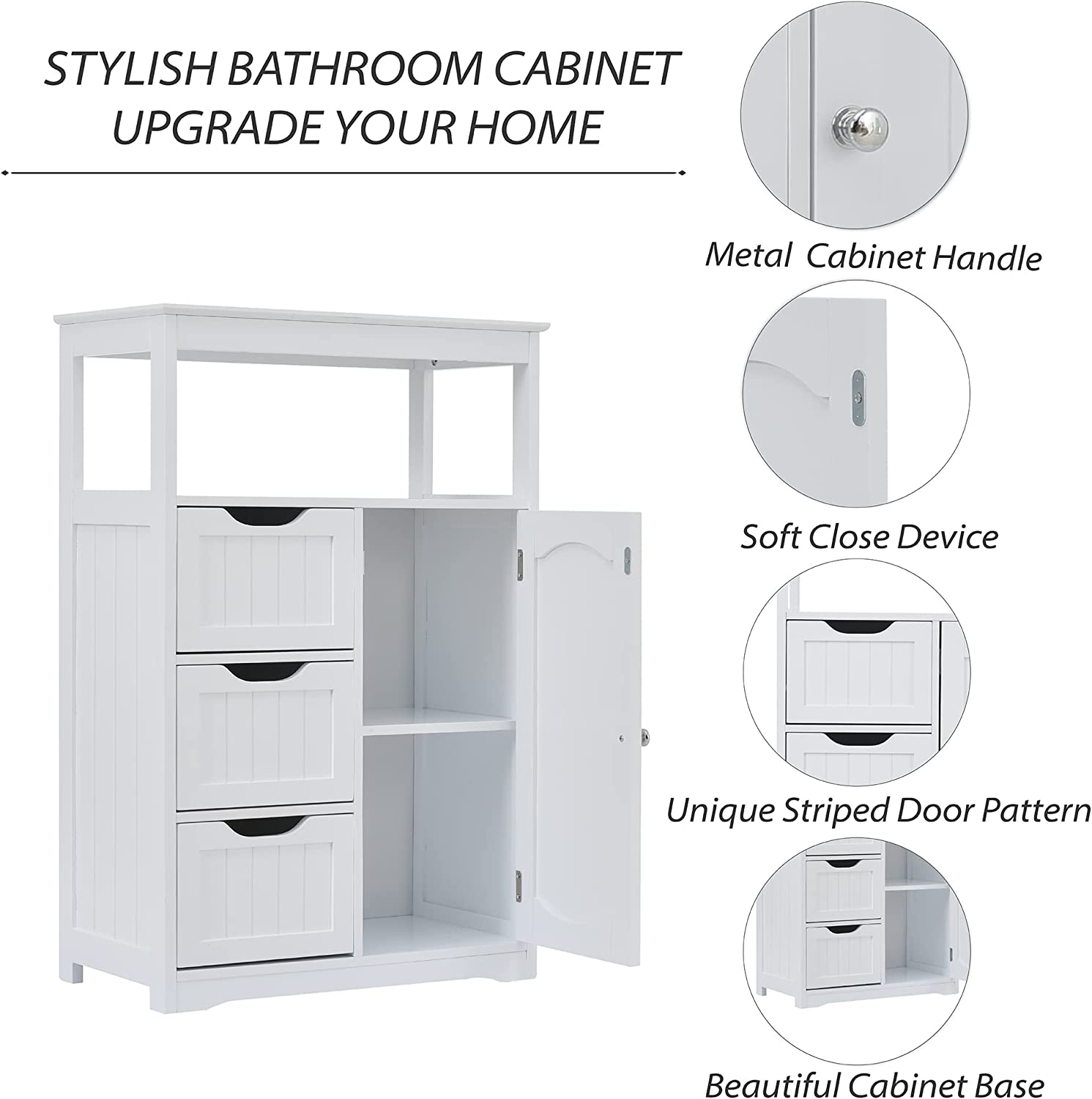 • Flexible Storage Space: This bathroom cabinet has a large and enough storage space: one top open shelf, three wide drawers, and one cabinet with door. You can put tissue, towels, shampoo, body lotion, soaps etc. into it. The upper open shelf allows easy taking stuff while the enclosed door and drawers keep dust away from your essentials.