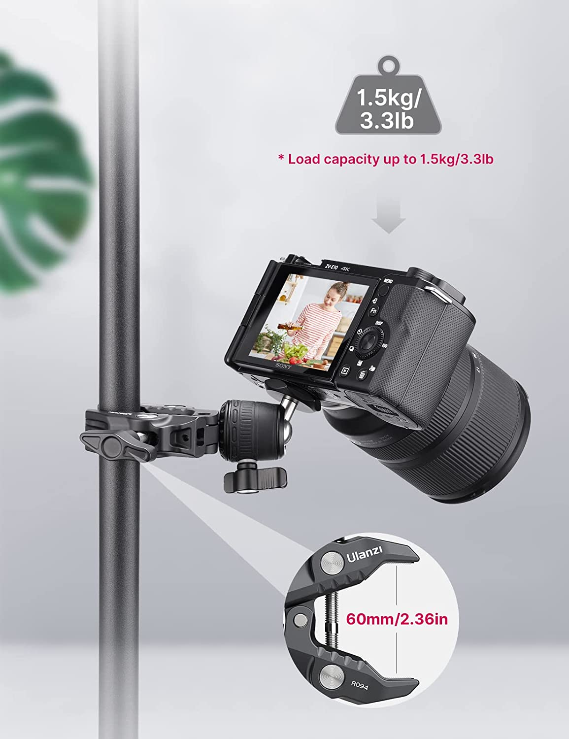 • Super Clamp: the open width of the super clamp ranges for 0.59in(15mm) to 2.3inch(60mm), which can help you fix the accessories on 2.3inch(60mm) rods/desktop. The super clamp enable you to add one more mounting position on desk/pole/tripod leg/camera cage/DJI Pole