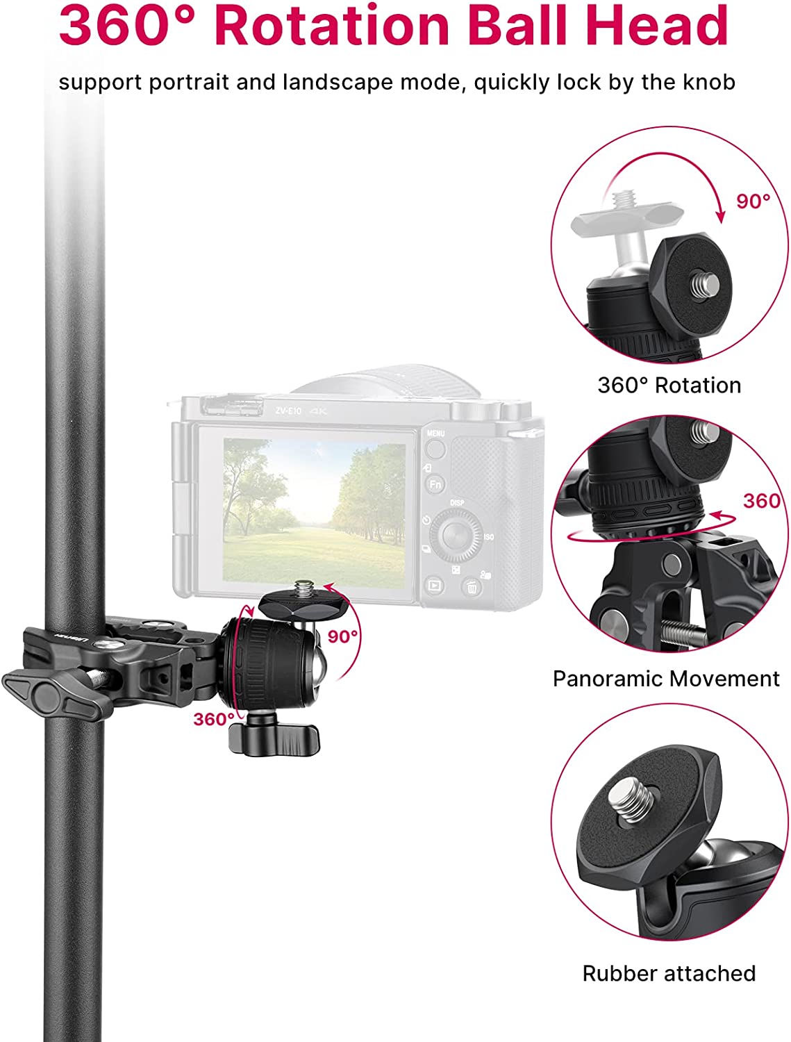 • 360° Rotation Ball Head: The camera mount can has vertical 360° rotation and 360° horizontal turning, support portrait and landscape mode, quickly lock by the knob. Rubber textured not only protect your devices, but also helps hold them in position much better