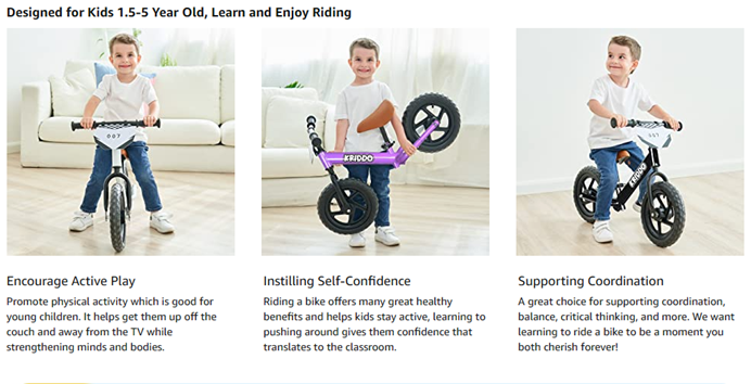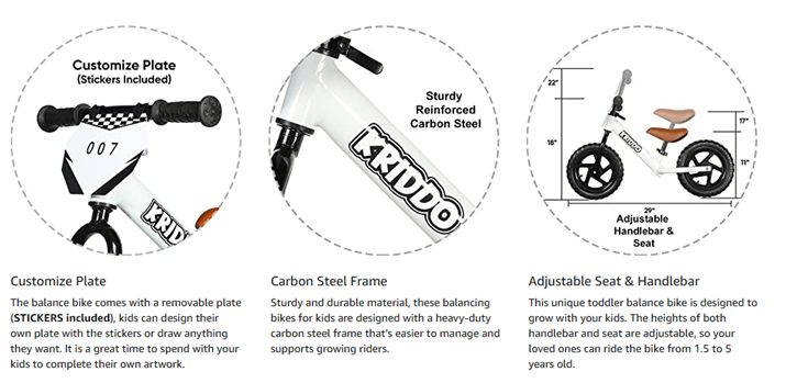 We developed the KRIDDO Balance Bike for ages 18 months to 5-years old to help young boys and girls learn about bike riding by pushing themselves along and gliding without relying on pedals. Fun and easy to use on all types of terrain, these easy-push balancing bikes even come with a removable customize plate, kids can draw anything on it or make it their own plate with stickers.