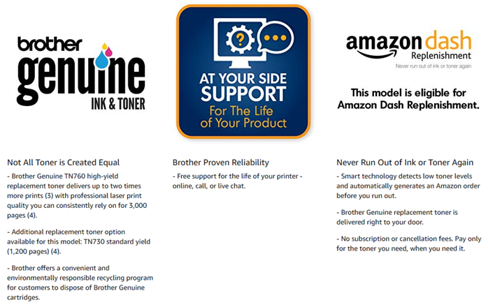 • Amazon dash replenishment enabled: Upon activation, Amazon Dash Replenishment measures the toner level and orders more from Amazon when it’s low