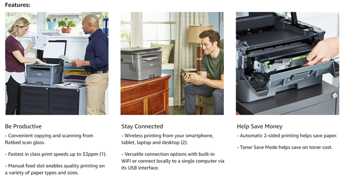 • Wireless printing & exceptional support : The easy to link wireless technology allows you to submit print jobs from your laptop, smartphone, desktop, and tablets (2). We provide free online, call, or live chat support for the life of your printer. At Brother, we want to ensure that your experience with us is exceptional