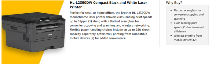 Infused with Brother’s latest technology and designed to enhance office efficiency, the Brother HL L2390DW is a reliable, robust, and affordable monochrome laser printer with copying and scanning capabilities that is perfect for the home or small office. The modern and updated replacement for the reliable Brother DCPL2520DW is built with a flatbed scan glass that provides convenient copying and scanning. It has also been updated with new features that allow users to scan and print directly from mobile devices, including tablets, and cloud based accounts. The HL L2390DW has been upgraded to optimize printing to meet the evolving needs of modern business. With lightning quick precision, the Brother monochrome laser printer features a class leading print speed of up to 32 pages per minute. You can easily connect via built in wireless network and USB interfaces and print wireless from your mobile devices. The automatic duplex printing feature helps save paper, and using Brother Genuine high yield replacement toner (TN 760) can help lower print costs (also compatible with TN 730 replacement toner cartridge). The tray with the capacity to hold up to 250 sheets helps improve efficiency with less refills and handles both letter and legal sized paper. Brother is dedicated to superior customer service and stands by our products by offering a 1 year limited warranty on this new monochrome laser printer. We also provide free online, call, or live chat support for the life of your printer. At Brother, we want to ensure that your experience with us is exceptional. If you have been looking for an exceptional monochrome laser printer with fast printing capacity and multiple user friendly features, add the Brother HL L2390DW to your Amazon shopping cart today. (1) Based on competing in class monochrome laser printers under 200 dollars. Print speed specifications gathered from manufacturer websites as of 1/9/2017.(2) Requires connection to a wireless network.(3) TN 760 High Yield vs. TN 730 Standard Yield. Up to two times more prints and lower printing costs based on yields and MSRP. Standard Yield and High yield cartridges sold separately.(4) Approx. toner cartridge yield in accordance with ISO/IEC 19752 (letter/A4).(5) Reprinted from PCMag with permission. Copyright 2017 Ziff Davis, All Rights Reserved.(6) The mobile device must have NFC capability and run Android OS 4.4 or later. Compatibility : ITU T Super Group 3.