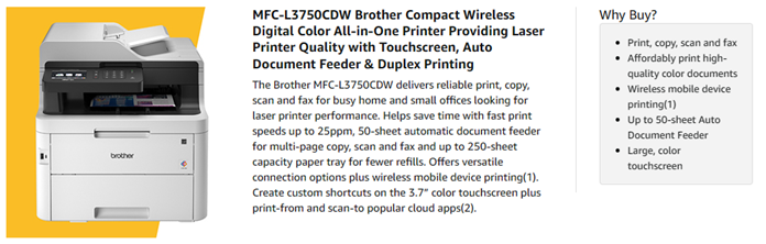 The Brother MFC L3750CDW offers versatile connection options with built in wireless, Ethernet and Wi Fi Direct or connect locally to a single computer via USB interface. Print wirelessly from your desktop, laptop, smartphone or tablet.(1) Print from and scan to popular cloud apps(2) directly from the 3.7" color touchscreen including Dropbox, Google Drive, Evernote, OneNote and more. Help save time by creating custom shortcuts on the touchscreen for your most used features. The Brother MFC L3750CDW compact digital color all in one printer has a one year limited warranty with free online, call, or live chat support for the life of your printer.