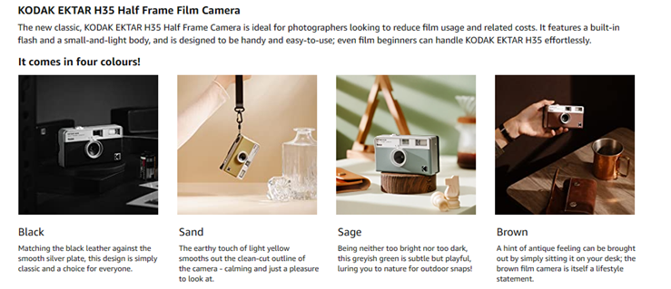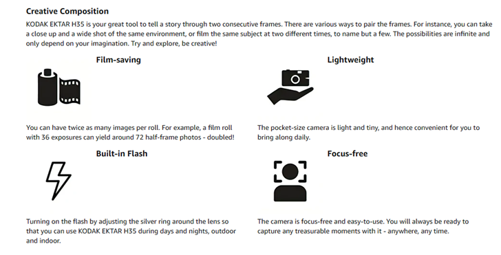 • ?​ Built-in Flash: Turning on the flash by adjusting the silver ring around the lens so that you can use KODAK EKTAR H35 during days and nights, outdoor and indoor.