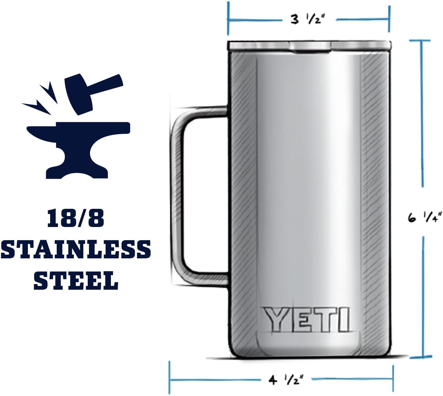 • The YETI 24 oz. Rambler Mug stands 6.4 in high and has a lip diameter of 4.6 in, and with the handle its 5 inches wide