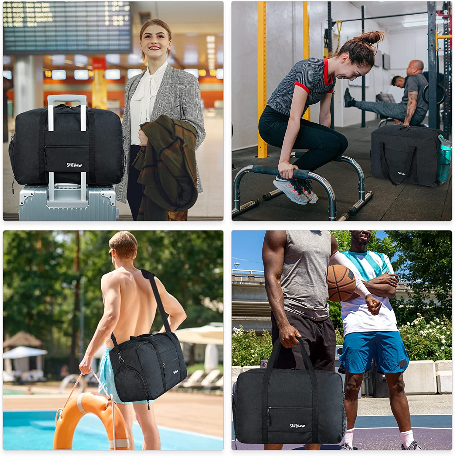 3 Carrying Options: over your shoulder, behind your back or by the bag's dual handles. You can use it as a sports gym bag, a carry on bag, a travel bag and a daily bag, perfect for workout, rides, gym, yoga, beach, pool, camping, practice days or weekend trips