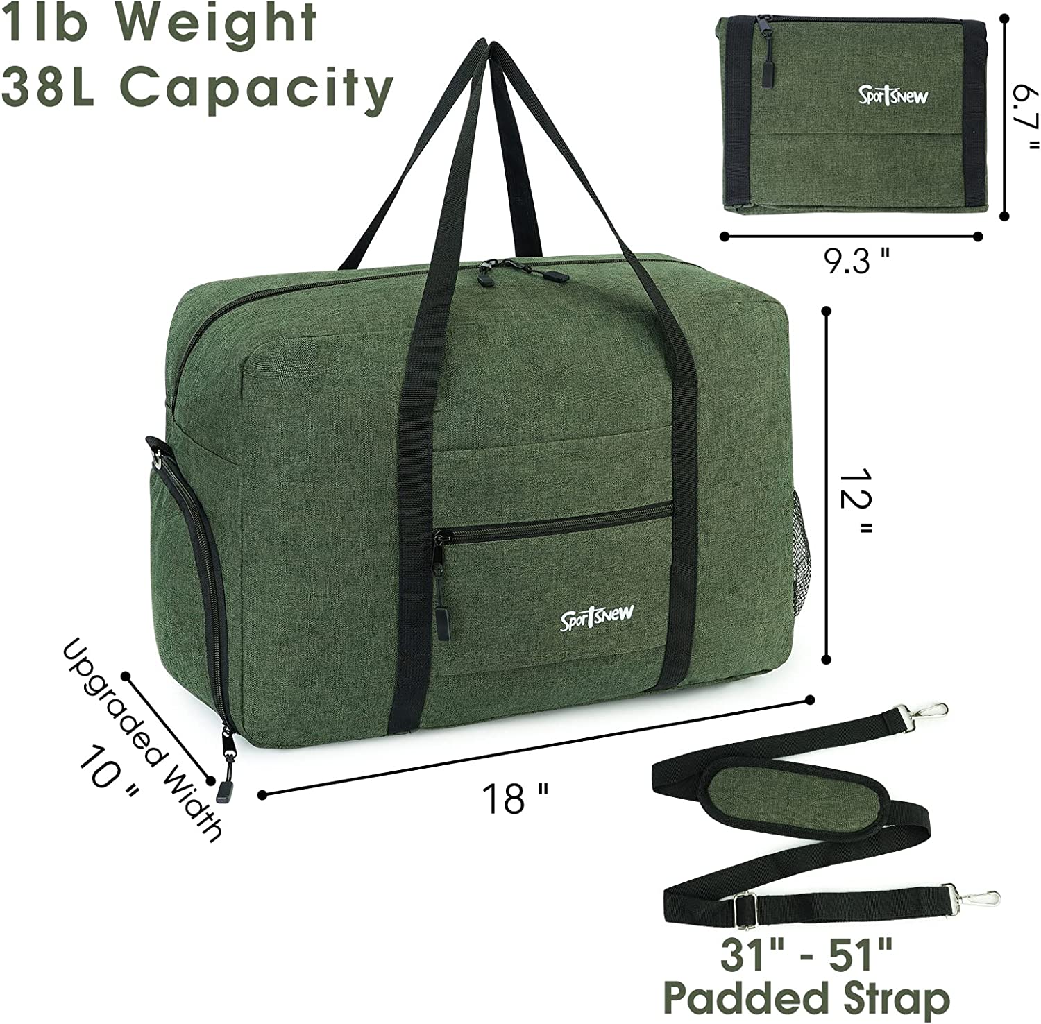 Size & Durable Construction: Dimensions when full: 19” x 12” x 10” with 38L capacity, folds flat 13” x 10” x 1.2”, weights only 1lbs, which is 30% lighter than traditional gym bag. Made with durable, water-resistant material with premium zippers. It features dual handles and an adjustable, detachable and padded shoulder strap for total comfort. The sturdy polyester body makes this bag ideal for long-term use