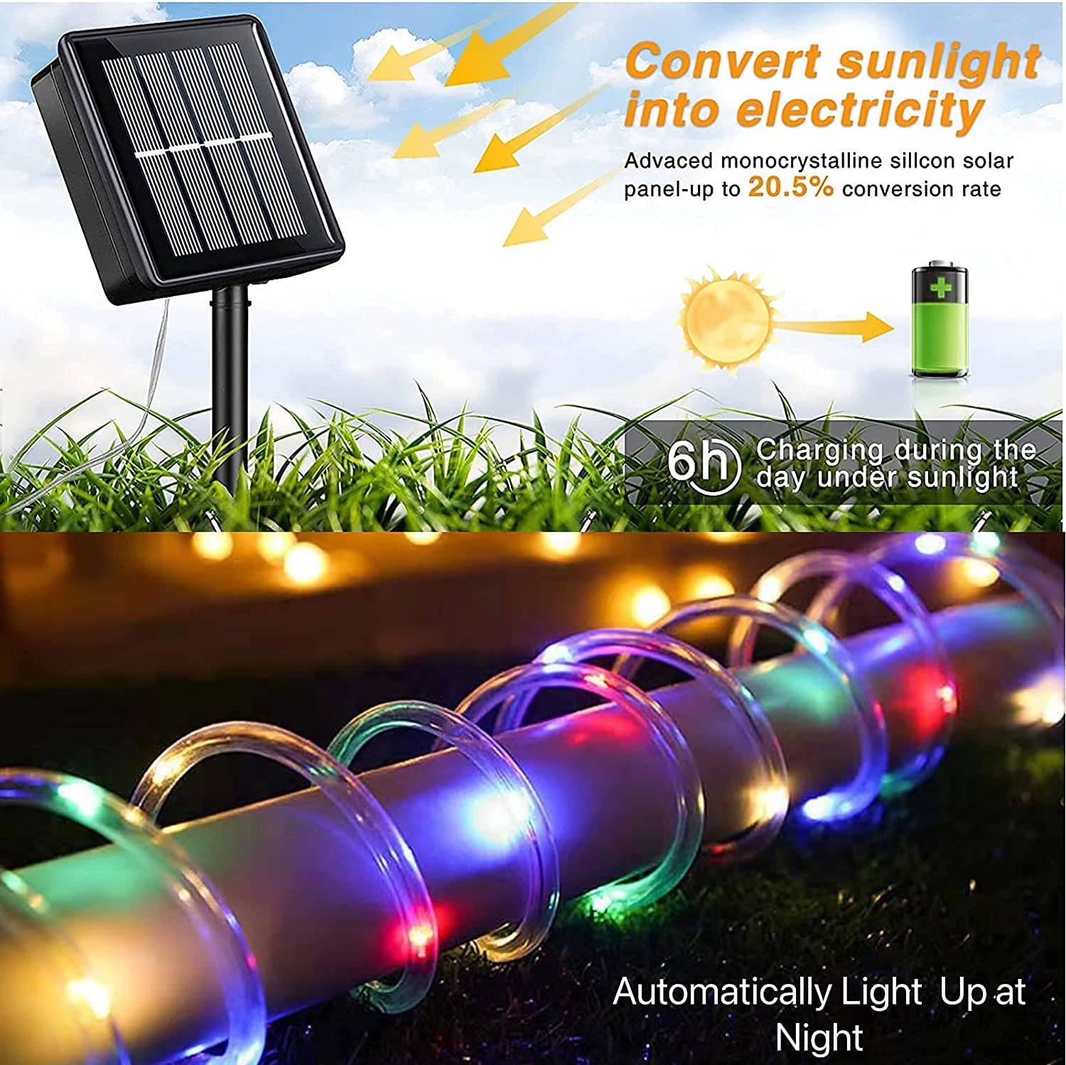 • ?Solar Powered & Environmentally Friendly:The rope lights is Solar powered that means energy saving and environmentally friendly. It absorbs solar energy in the daytime, turns on automatically at dusk and no need battery nor extra utility electric cost. The built-in large-capacity battery makes the solar string lights last for up to 12 hours after the panel absorbs enough sunshine during day.