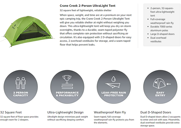 | Included Components | Tent Body, Rainfly, Poles, stuff sack |