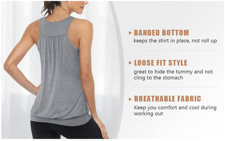 • Loose fit racerback tank tops with the bottom band, is great for yoga and workout