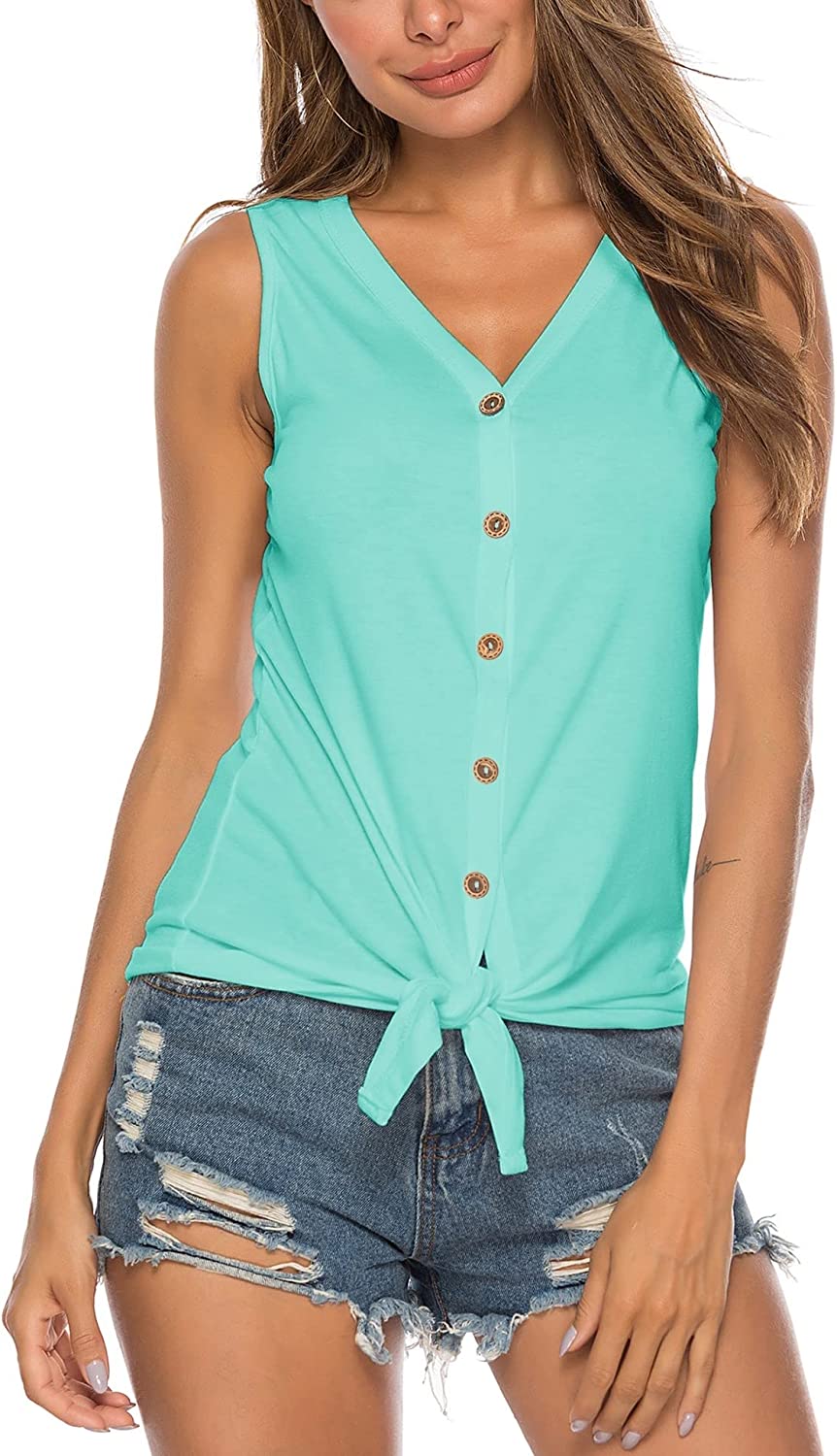 【Features】 Sexy V neck, front knot, sleeveless casual womens tops, stretch Shirt, tank blouse with button down design, curved hemline, loose fitting shirt for Ladies