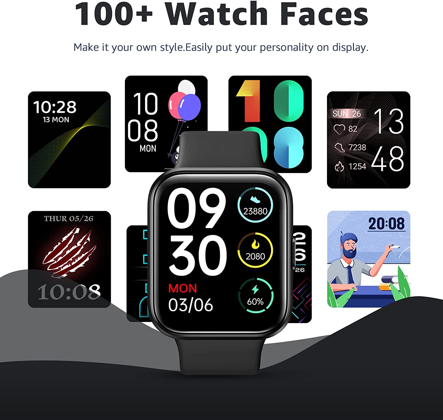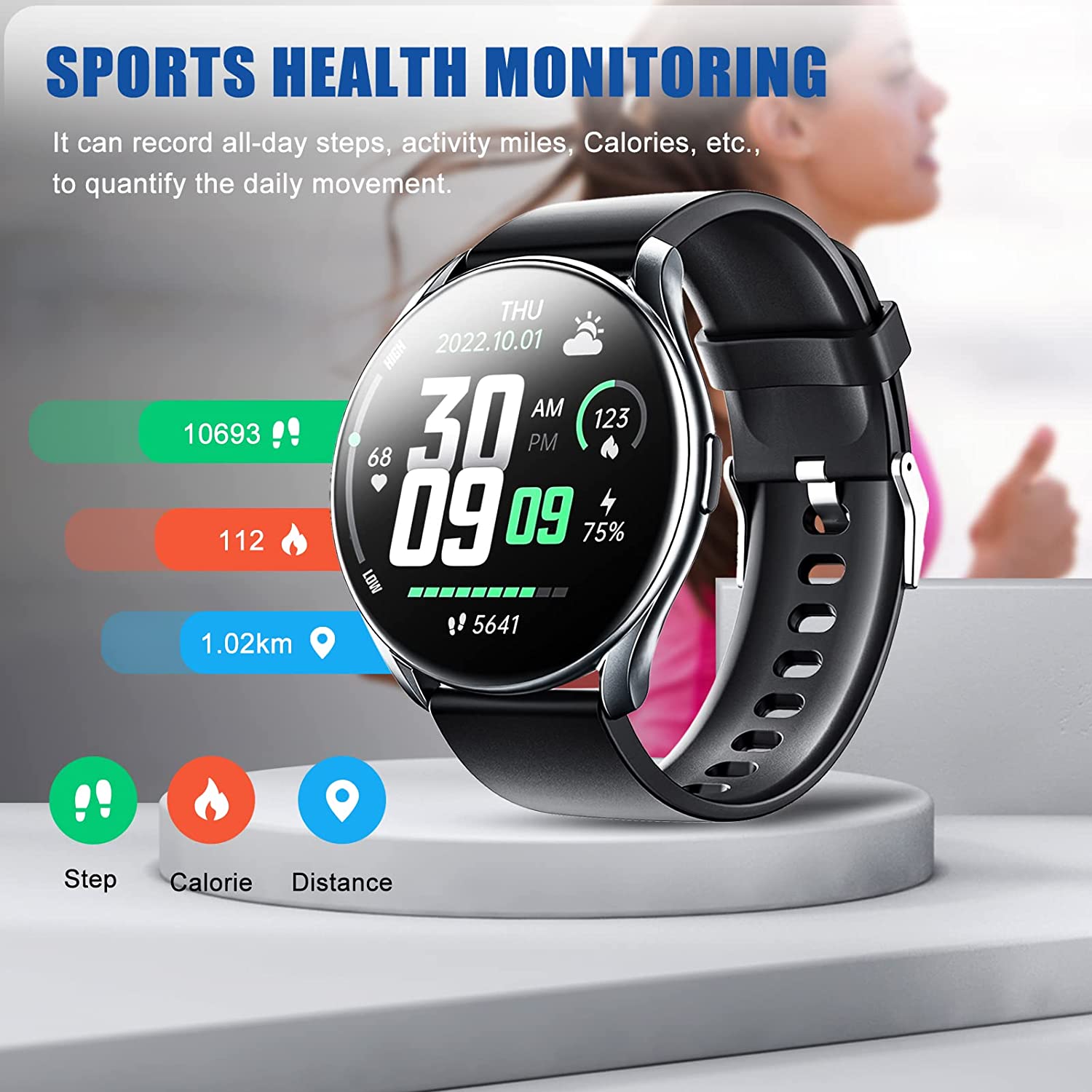 • 8 Customized Watch Faces 60 Sport Modes-60 sport modes that more accurate to track your activities like heart rate, Calories burned, Steps, Gps record, Sport time, Sport speed and so on.Support multiple reminders and stay connected to your daily life