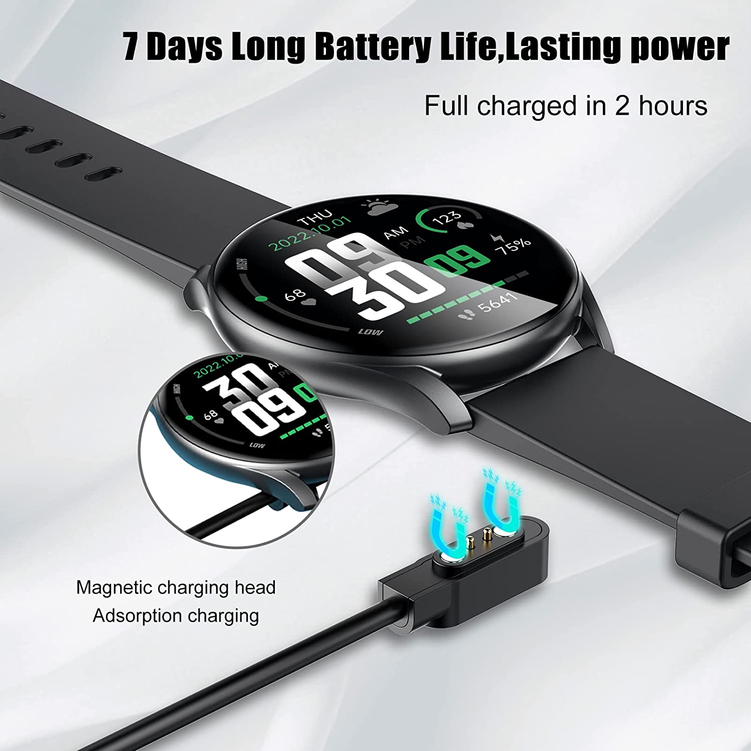 • More Than 30 Days Standby Time-Full charge time is about 2 hours, Normal using time is about 6 days, More than 30 days standby time, .Compatible with Android 6.0, iOS 9.0 or above!Get call, Calendar, Text, Alarm and goals to achieve notifications