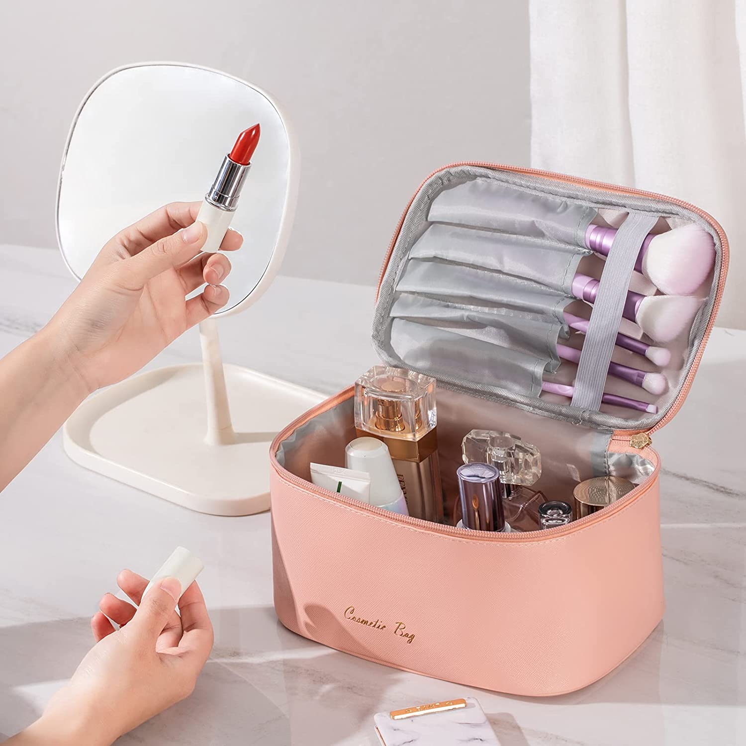 • ?ROOMY ENOUGH: Medium Good size, nice and tall, big enough for all your make up,lotion, tweezers, pony tails,hair brush skincare products and even a big mirror; Also as a great toiletry bag easily holds all your travel-size toiletries: electric toothbrush, toothpaste, shampoo, towel etc.