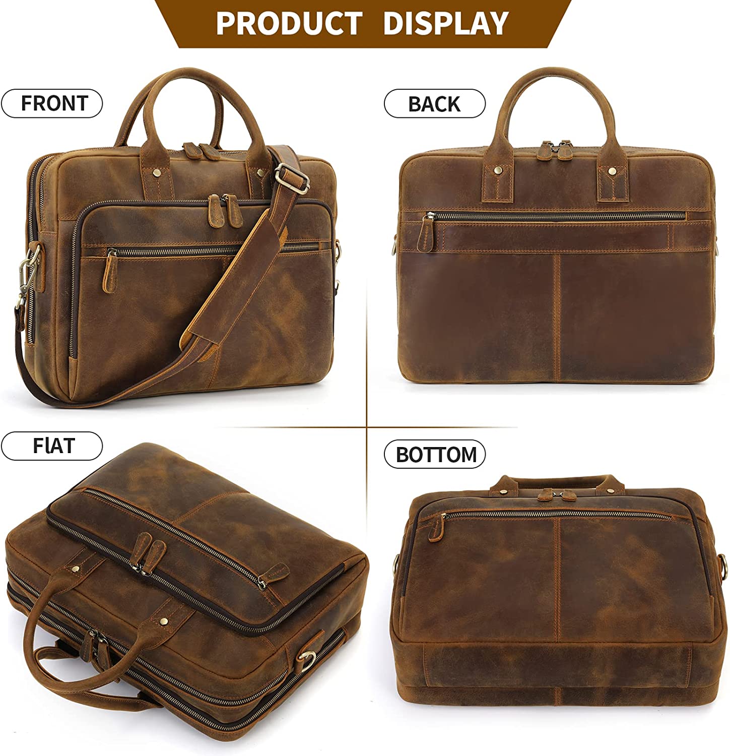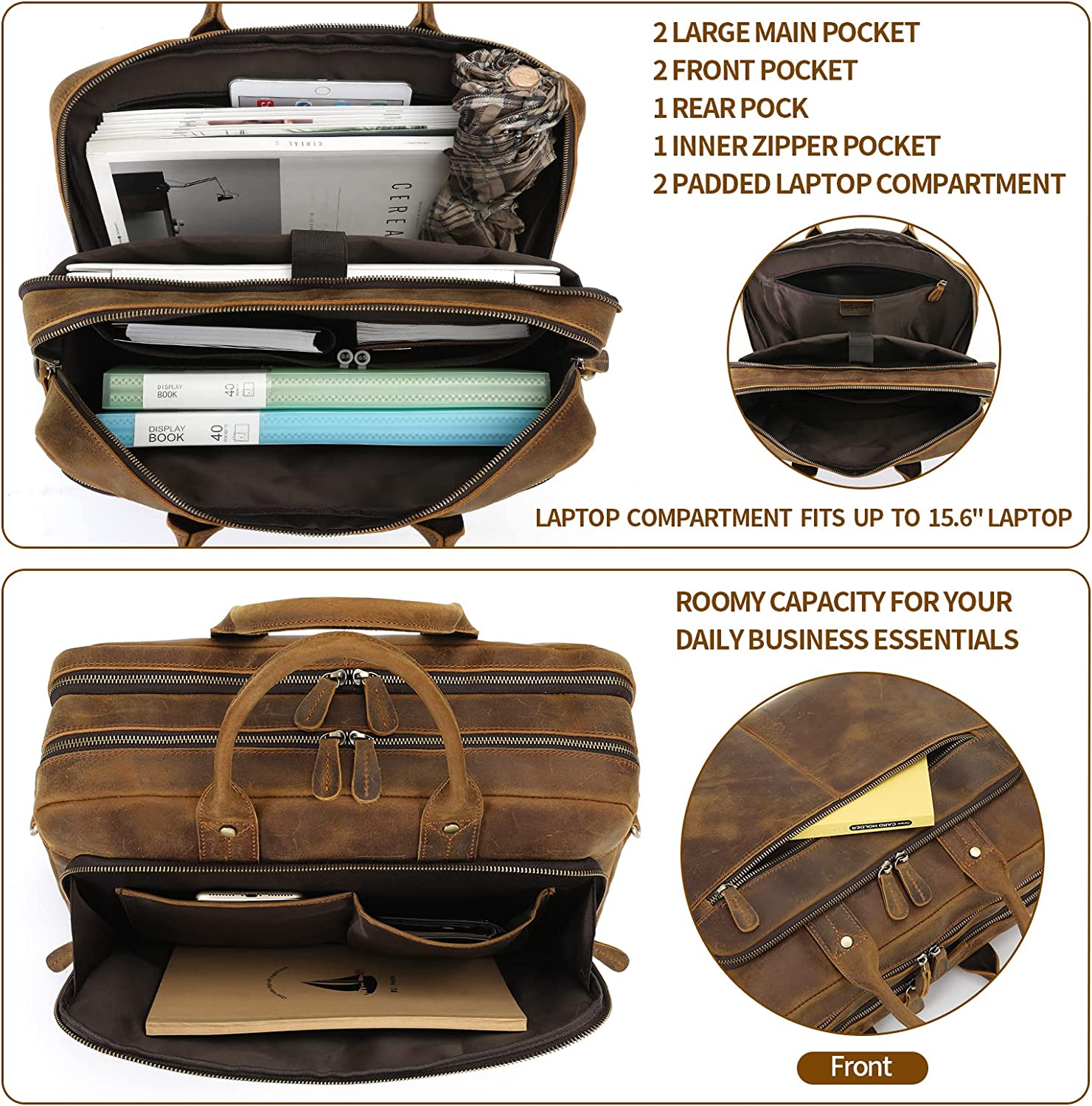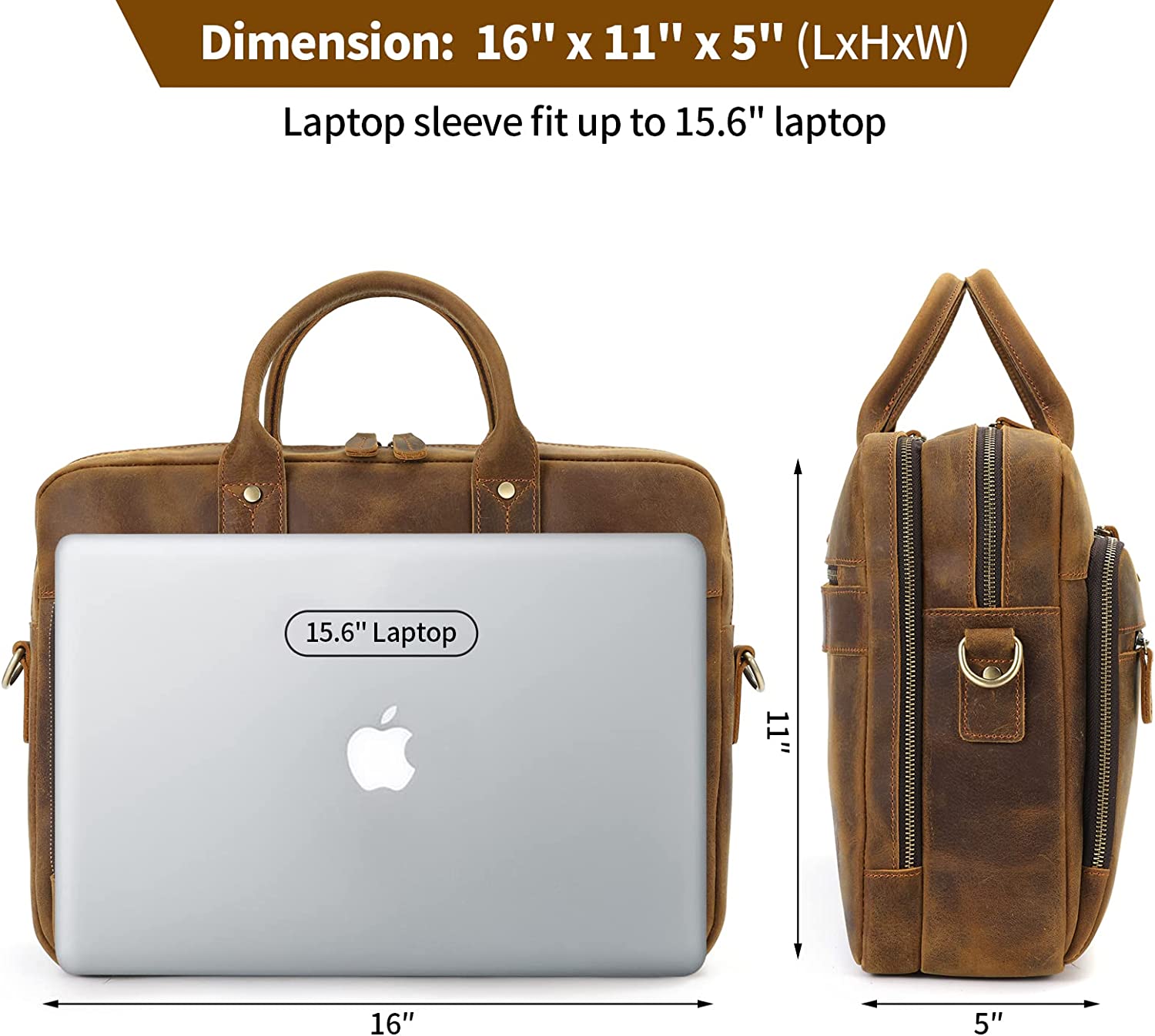 • Large Satchel Bags : 16"x5"x11" large-space leather laptop bag, which can accommodate mobile phones and iPads of various sizes. And this leather briefcase is equipped with a padded laptop stand, which can maintain stability and easily fix the 17.3-inch laptop and Everything you need for work and travel.