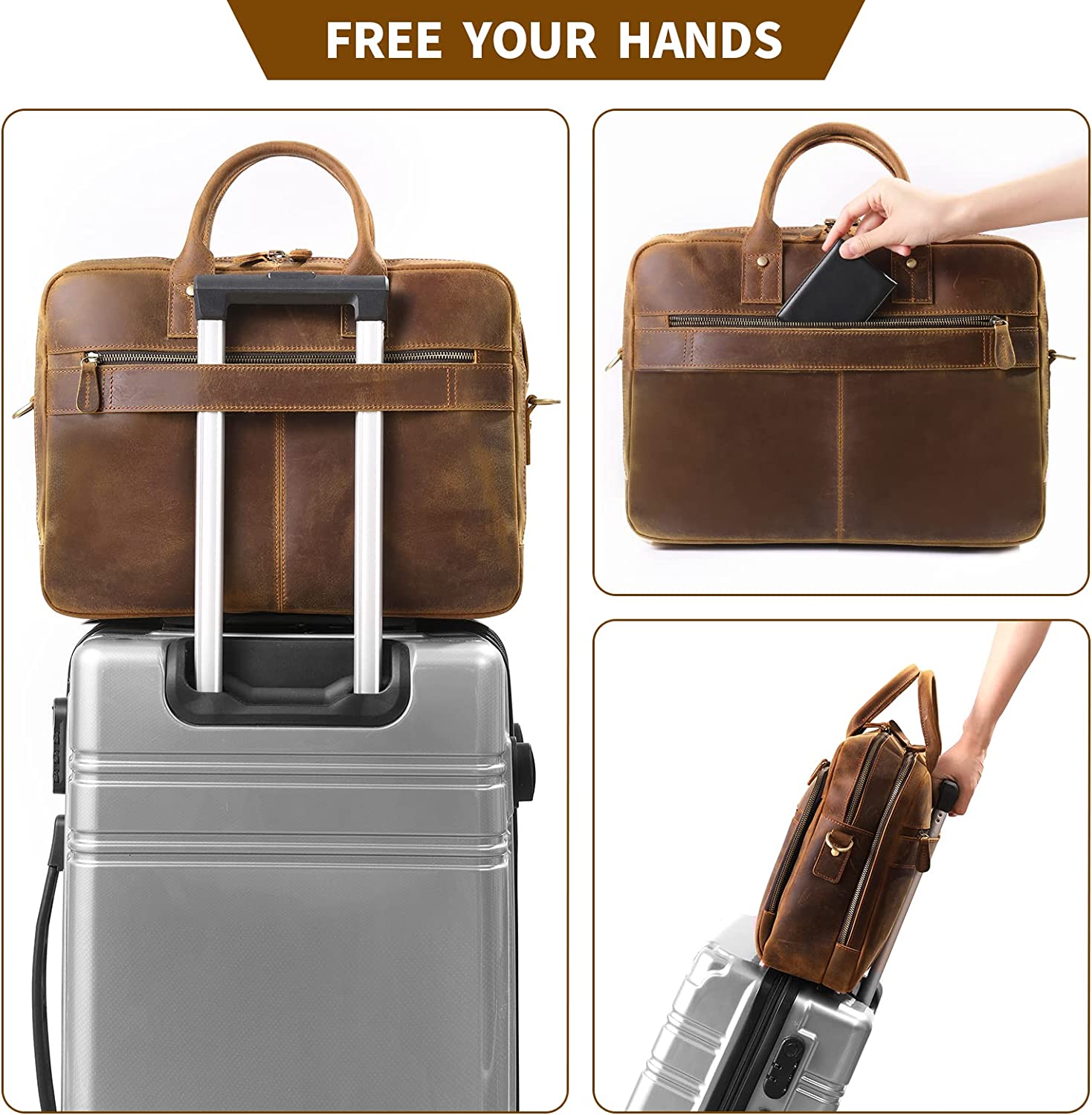 • High Quality Leather Briefcase: The briefcase is made with thick full grain leather lined with durable canvas and are Handcrafted by skilled craftsmen.This leather will become glossy and even more attractive for a longer time.