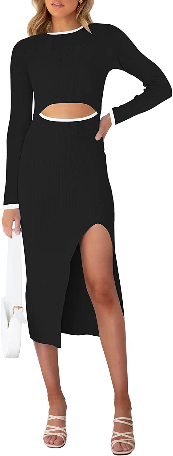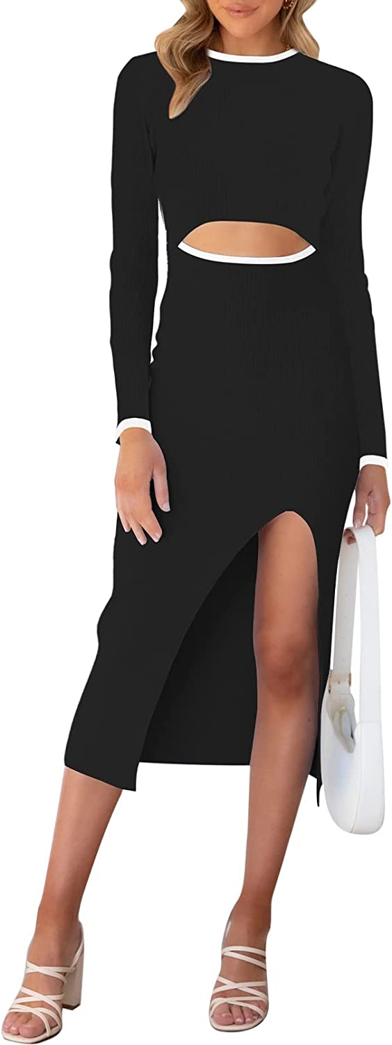 Cutiefox Women's Long Sleeve Cut Out Dress Side Slit Ribbed Knit Bodycon Midi Dresses