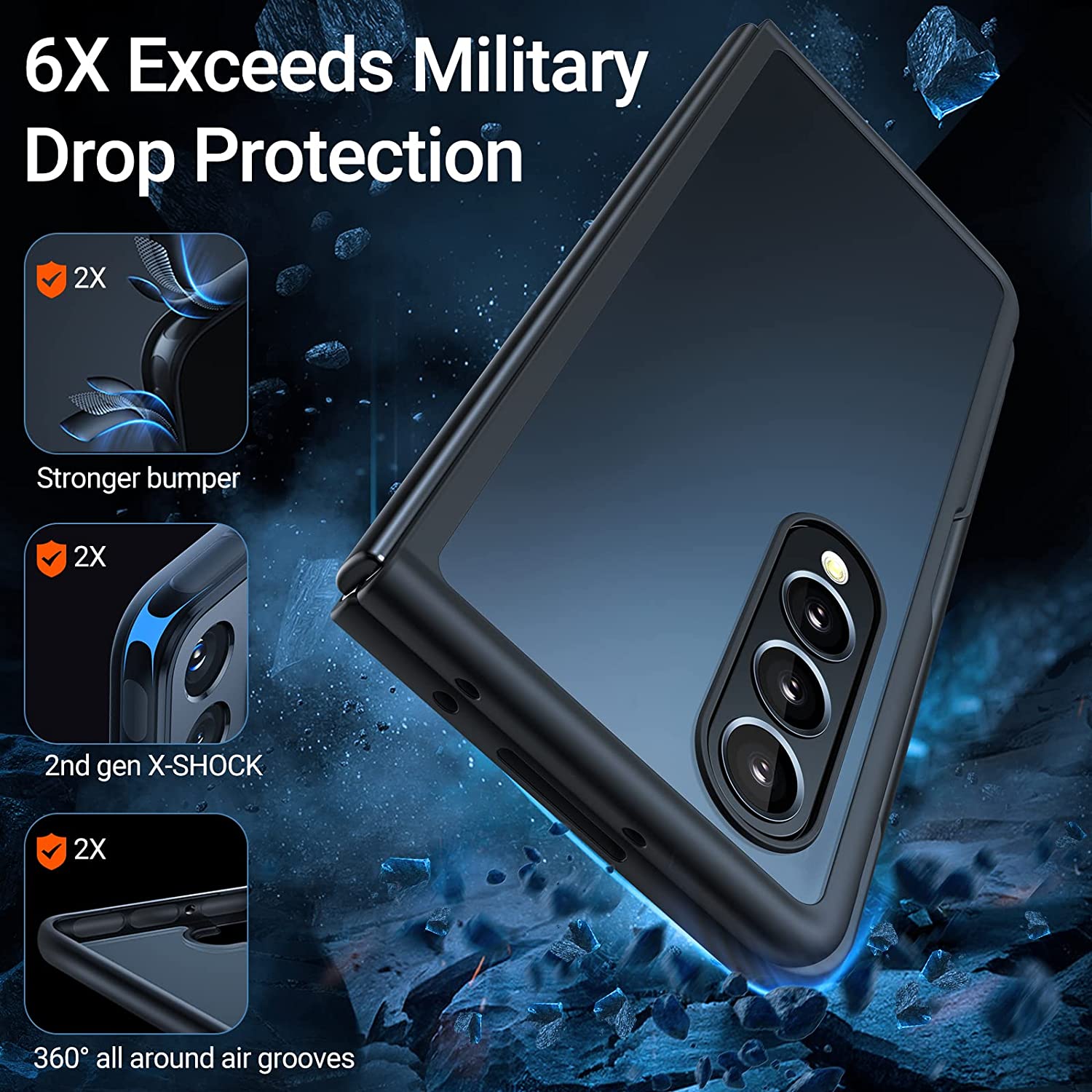 - [Certified Military Grade Protection] Z 4 fold case provides certified MIL-STD-810H protection, engineered with tough polycarbonate and soft flexible rubber bumper to protect your new Phone from daily wear and tear. It comes with build in 360° all-around powerful impact dispersion airbags and 4 corners equipped with 2nd gen X-SHOCK anti-collision angle technology strongly protect the protruding mobile phone from falling, collision and face-up or face-down injuries