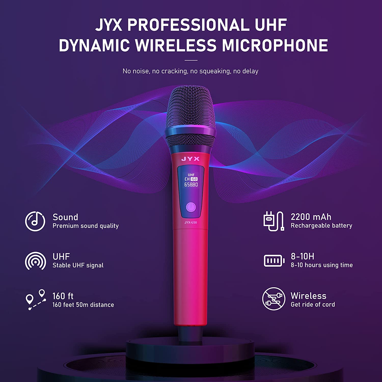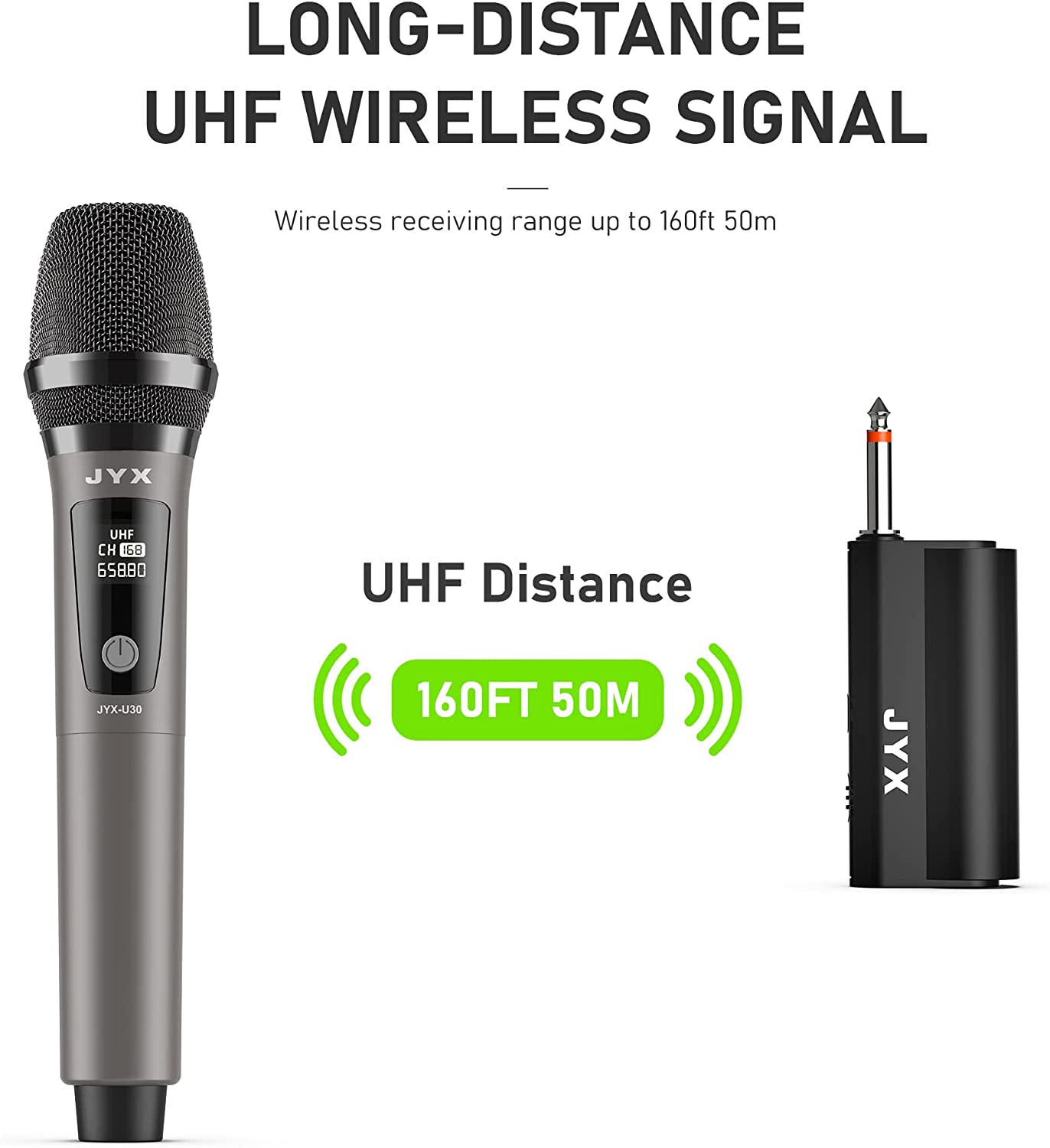 • ? <b>Professional UHF Wireless Microphones:</b> Adopt advanced UHF(Ultra High Frequency) technology, create an output signal that are both steady and strong. It has the strong anti jamming ability, let your singing never interrupted.