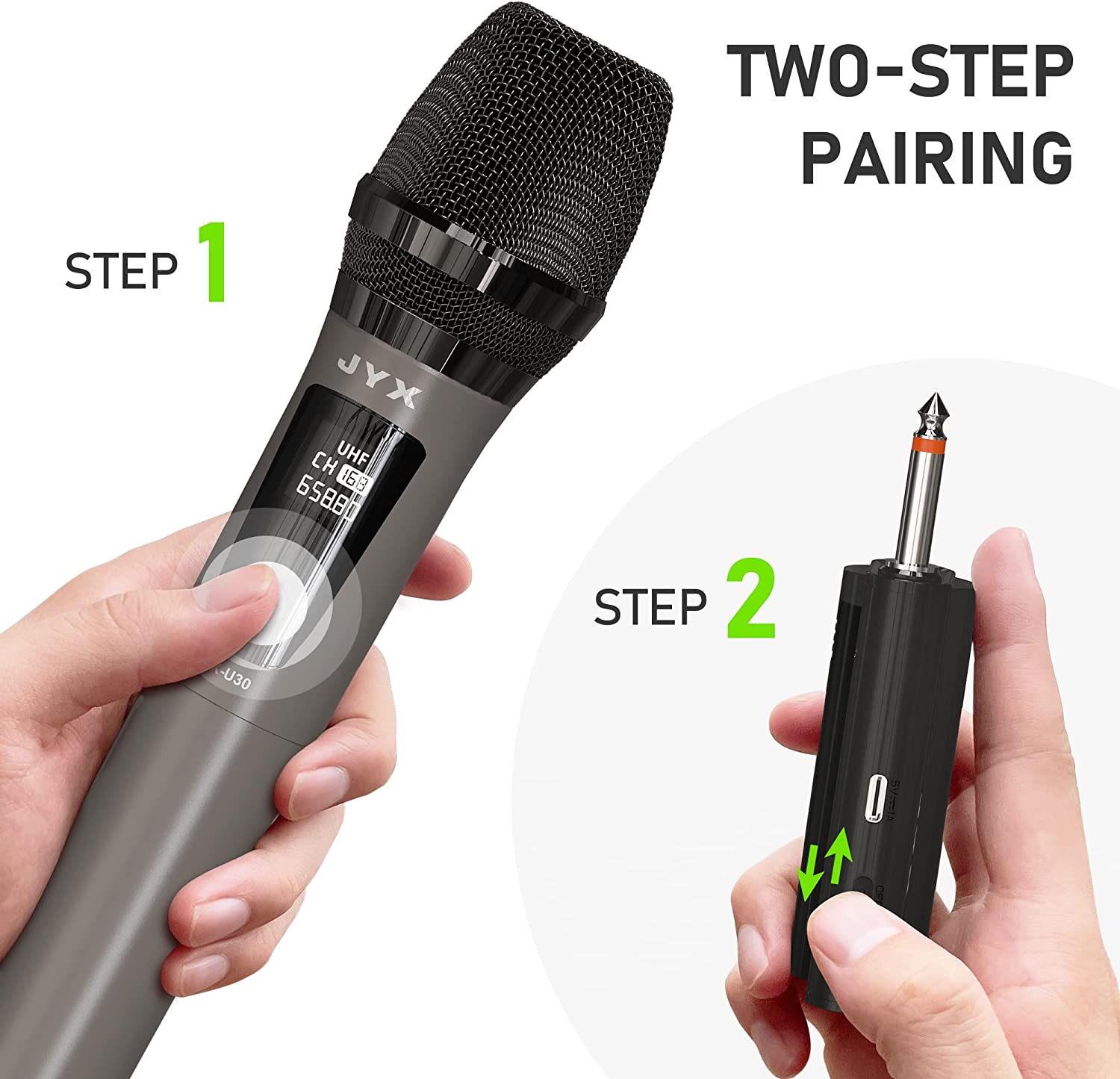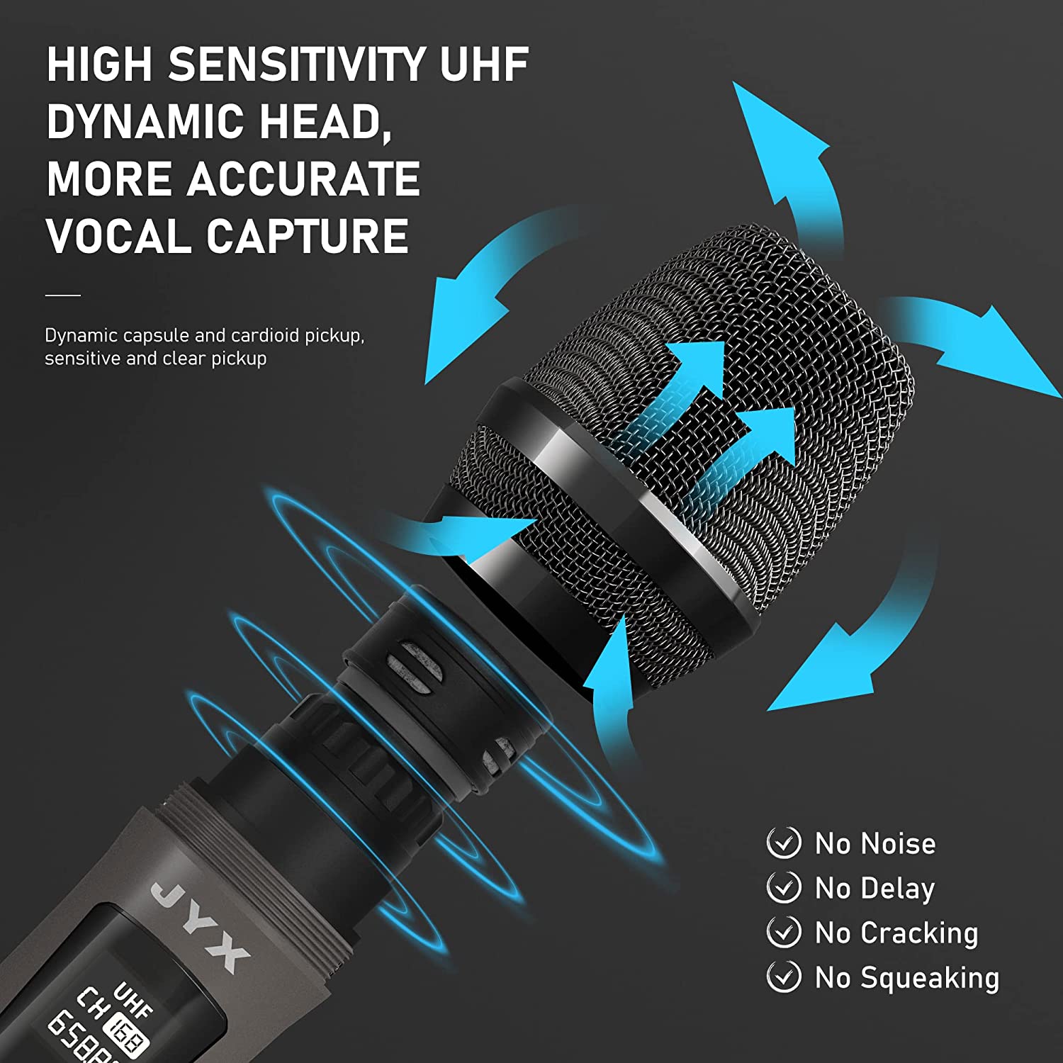 • ? <b>Superb Pro Sound Quality:</b> The wireless mics, equipped with dynamic unidirectional microphone core (95dB), only pick up your voice and minimize background feedback. Make the vocal is clearer. Reproduce more excellent, clear, crisp, pure and full sound and eliminate background noise and howling. Great for karaoke, party, meet, KTV, DJ, wedding, class, speech, stage etc.