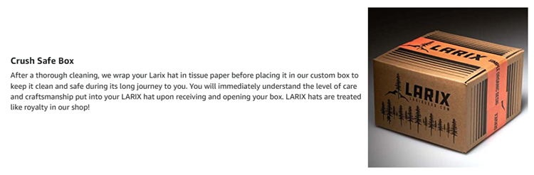 • SHIPPED IN BOX : After your hat has been cleaned and prepped we wrap your Larix hat in tissue paper before placing it in our custom box to keep it clean and safe during its long journey to you. IF YOUR HAT DOESN'T ARRIVE IN A BOX PLEASE REACH OUT TO US DIRECTLY TO LET US KNOW. You will immediately understand the level of care and craftsmanship put into your Larix hat upon receiving and opening your box.