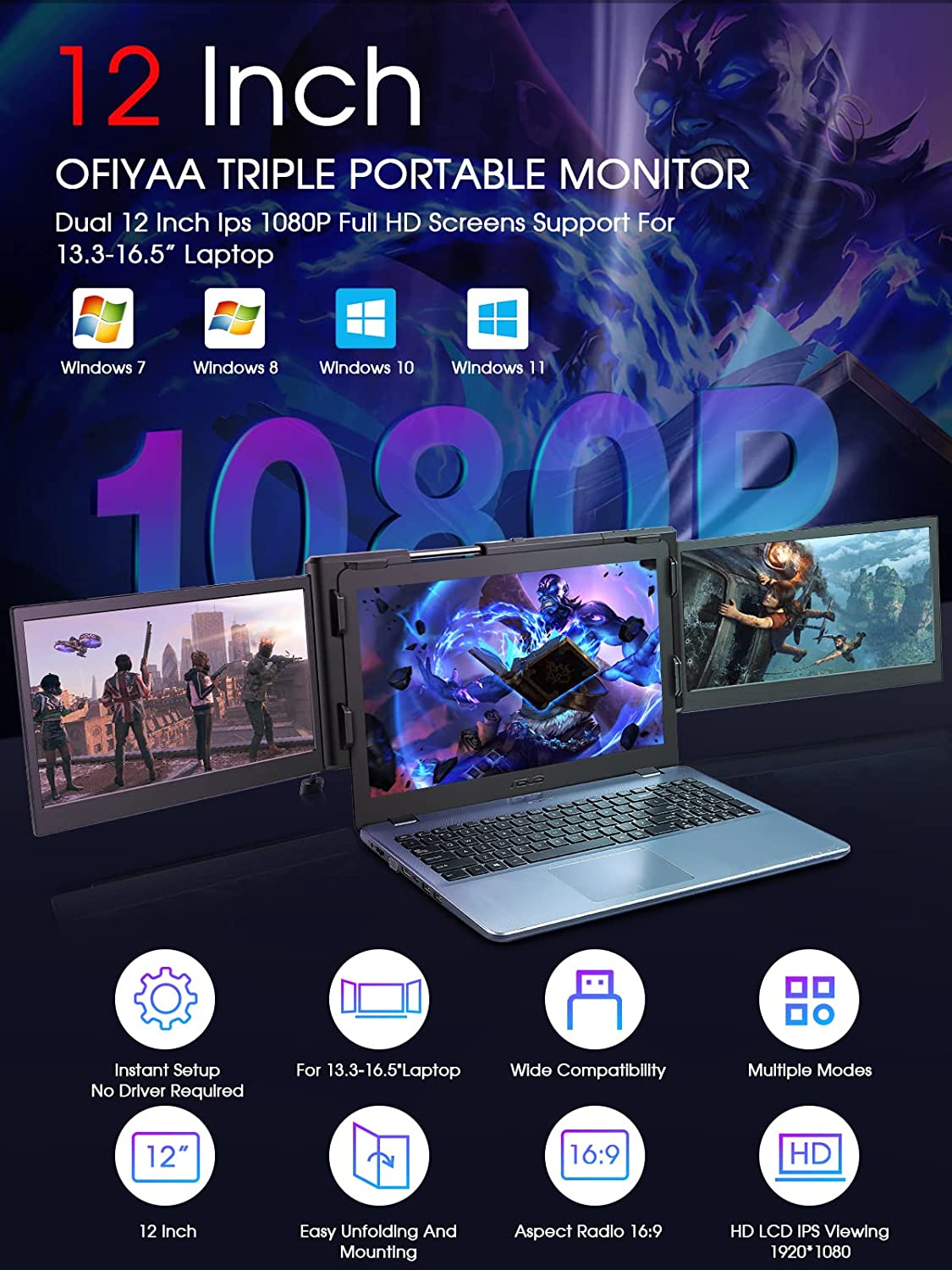 【Easy-to-use design】 The triple portable monitor for laptop can be easily clipped to the laptop frame by just press the button to adjust the size, No need any attachment such as magnets and snaps. Design with a stable and retractable bracket,can be effectively hold the extender to a suitable angle,at the same time prevent the weight of the extender hurt your laptop own screen.