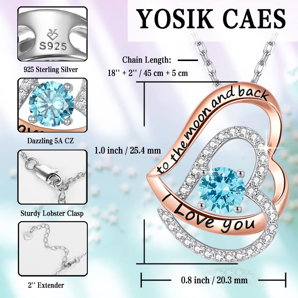 YosikCaes 925 Sterling Silver Double Heart Birthstone Pendant Necklace for Women, 18K Rose Gold Plated, Hand Set with 5A Zirconia Stones, 18+2" Chain Length, 10mm Lobster Claw Clasp with Jewelry Polis