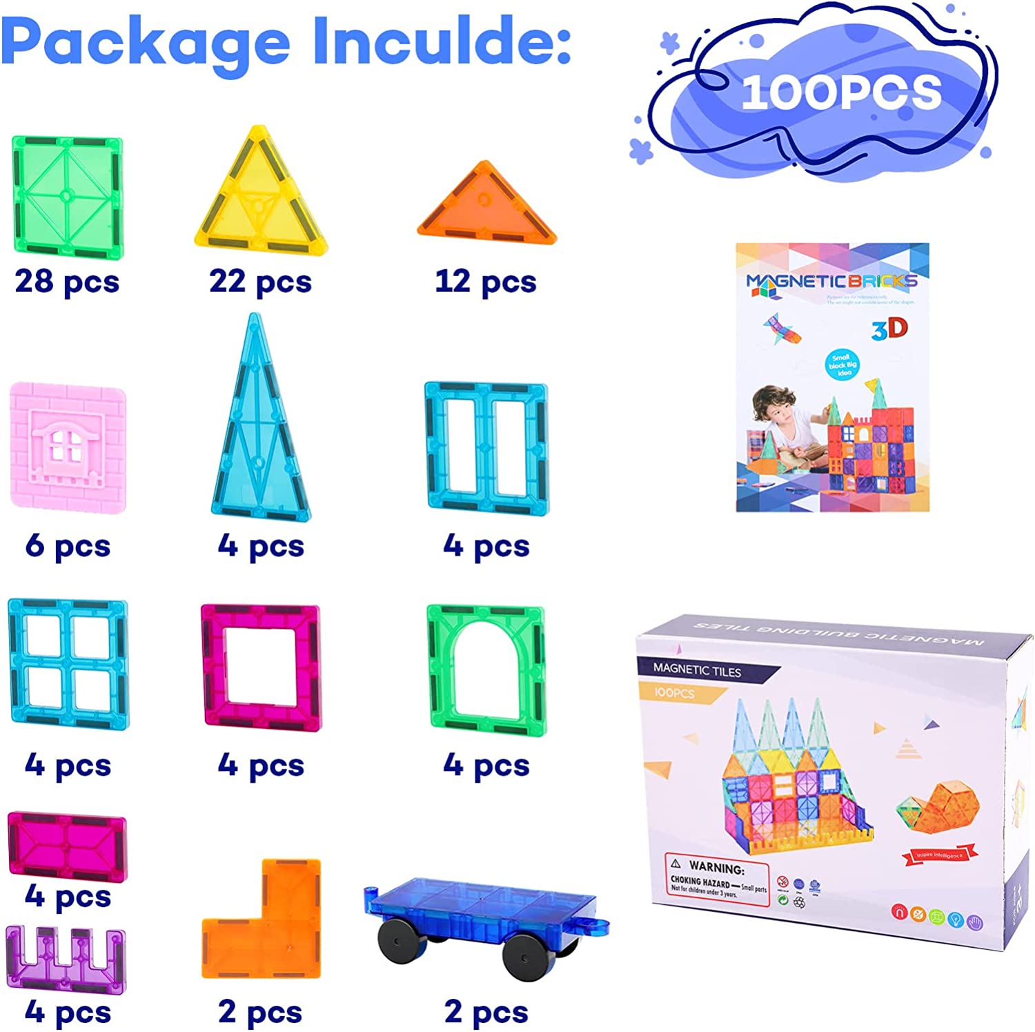 • Magnetic building tiles set: 98 basic shapes plus 2 cars ( squares, triangles, Rectangles, E-shapes,doors,click-ins),with beautiful package and an idea book. Compatible with other brands Superior quality, ASTM-approved, lead-free, ABS plastic, food-grade material, strong magnets sealed within the plastic frame.safe play toys for your kids