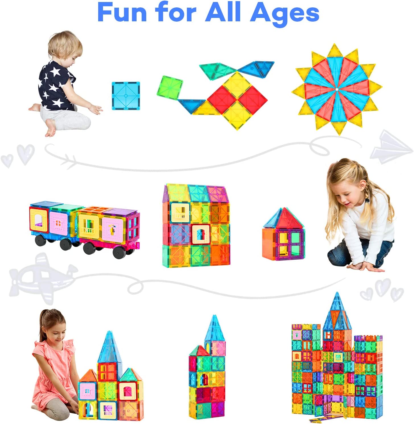 • Learning by Playing: The magnetic building tiles help your kids learning about shapes, colors and color-match, construction, engineering, team work, motor skills.Endless possibility from 2d pattern to 3d models inspire imagination, creativity,3D spatial thinking.