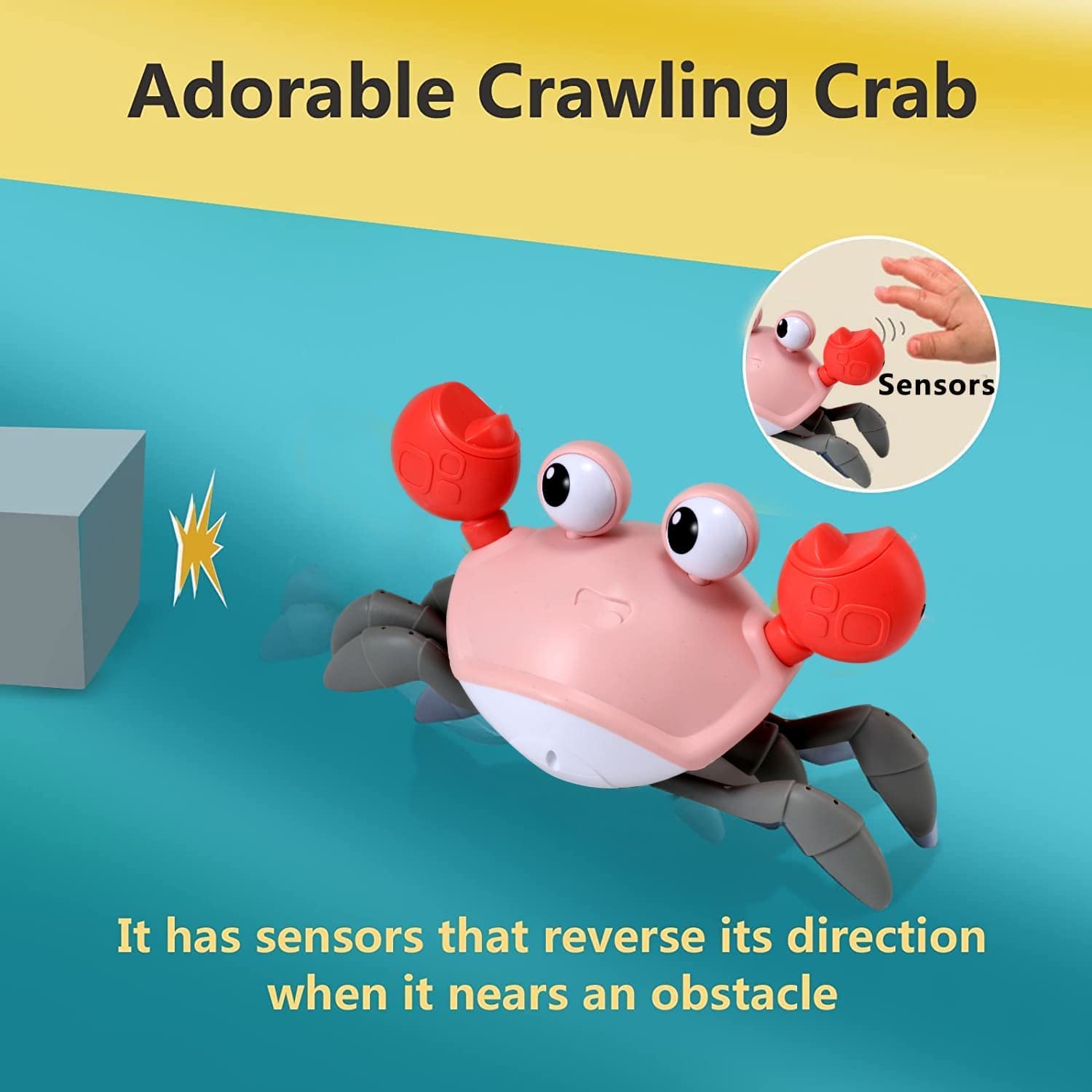 • ? Crawling Crab Baby Toy: It moving fast, skitters sideways like a real crab, and plays fun sounds and music and lights up. It has sensors that reverse its direction when it nears an obstacle.