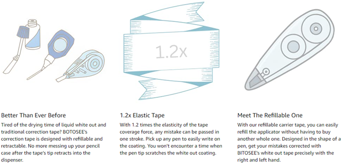 • REFILLABLE - Designed in the shape of a pen, get your mistakes corrected with BITOSEE's white out tape precisely with the right and left hand.