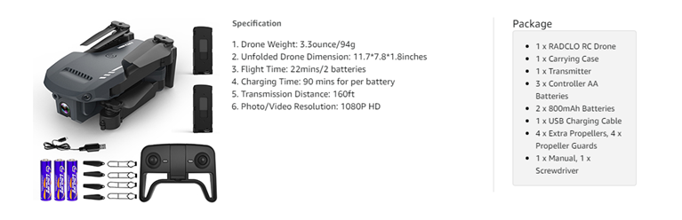 Larger Unfolded Body SizeOur drone's body size is 11.7*7.8*1.8inches(unfolded), and its weight is 94g/3.3ounce, which makes it bigger and owns better wind resistance.