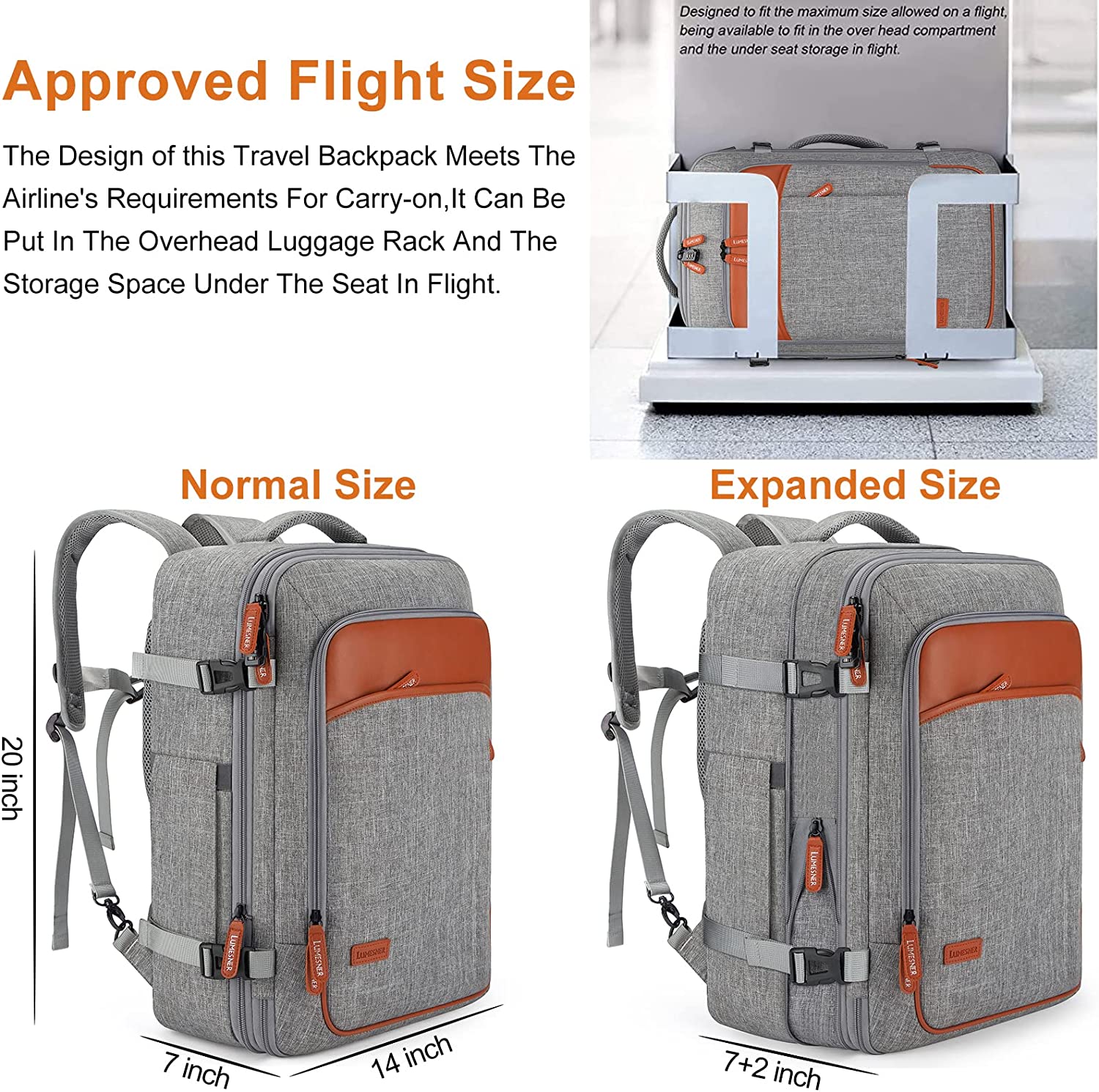 ?LARGE CAPACITY & EXPANDABLE:This extra large travel backpack with expandable feature offers you more packing capacity up to 40L.Unzipping to get larger storage space then can easily hold packing cubes, make-up bag, outfits, camera bag and gear for 3~7 days of travel.The carry on backpack fits overhead and under seat while on state of standard carry on size, is ideal for men, women, weekend traveler, or occasional vacationer.