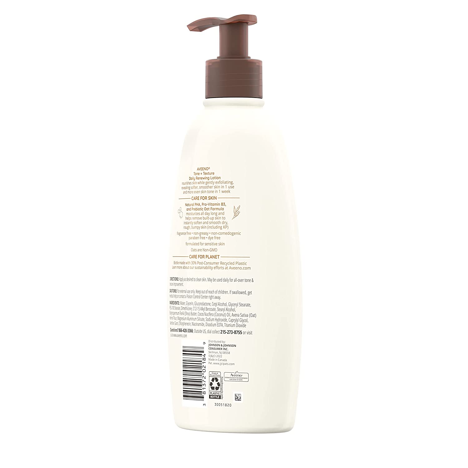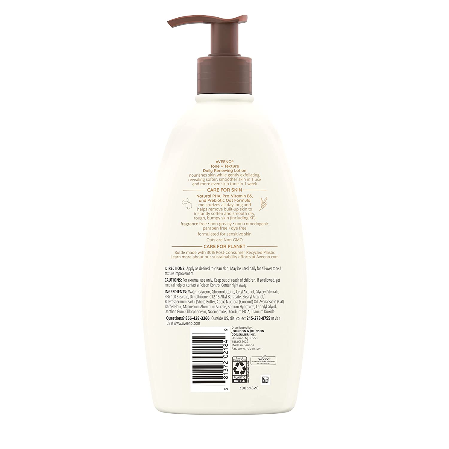 • 18-fluid ounces of Aveeno Tone + Texture Daily Renewing Lotion with Prebiotic Oat, Natural PHA and Pro-Vitamin B3 to gently exfoliate and hydrate sensitive skin while helping bumpy skin, roughness and uneven tone