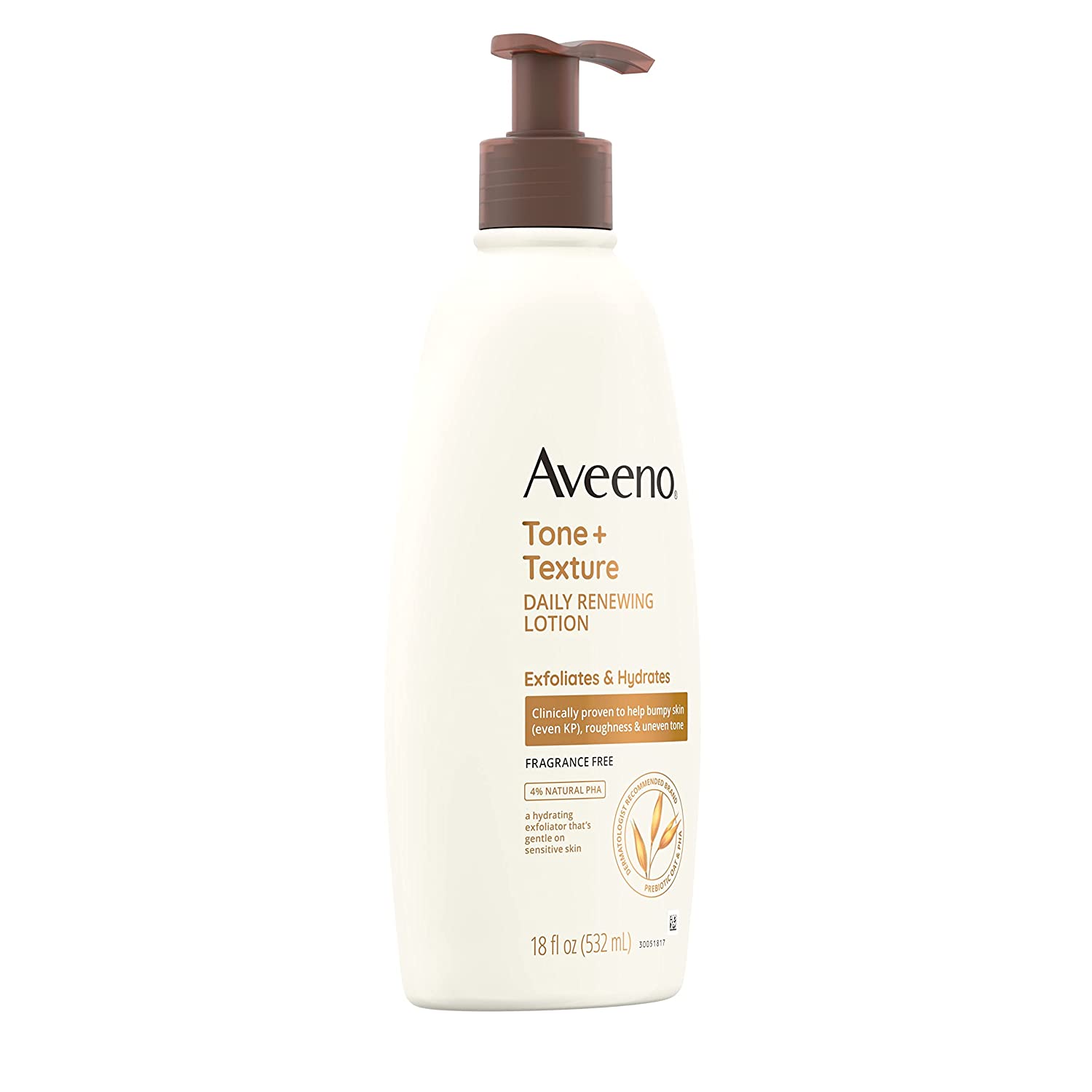 • From a dermatologist-recommended brand, Aveeno Tone + Texture Daily Renewing Lotion gently exfoliates and hydrates sensitive skin and helps bumpy skin (including KP), making it the perfect addition to any daily skincare routine