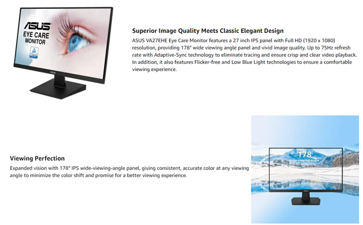 The frameless Asus VA27EHE eye Care monitor features a 27-inch IPS panel and 178° wide viewing angle For a vivid image quality with minimal color shifeet Eliminate tracing and ensure crisp and clear video playback with its featured Adaptive-Sync technology and refresh rate of up to 75Hz.