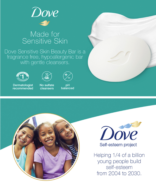 Dove Sensitive Skin Beauty Bar combines classic Dove cleansers and ¼ moisturizing cream in a fragrance free, hypoallergenic bar that’s gentle enough for sensitive skin. And now, we are bringing you Dove's same great formula in an all-new look. Dermatologist recommended and suitable for daily use, it can be used as a hand soap, gentle facial cleanser and body soap. Proper sensitive skin care depends on having a cleanser that truly cares for your skin and won’t dry it out like an ordinary soap can. Washing with regular soap can cause skin to feel dry and tight. What makes Dove different. It’s the combination of gentle cleansers and moisturizing ingredients that help to nourish skin. With unscented, hypoallergenic cleansers and 1/4 moisturizing cream, Dove Beauty Bar can be used as a face cleanser, as well as a gentle cleanser for your body and hands, leaving you with instantly soft skin and lasting nourishment. The secret to beautiful skin is moisture, and no ordinary bar soap hydrates skin better than Dove. At Dove, our vision is of a world where beauty is a source of confidence, not anxiety. That’s why we are on a mission to help the next generation of women develop a positive relationship with the way they look—helping them raise their self-esteem and realize their full potential.