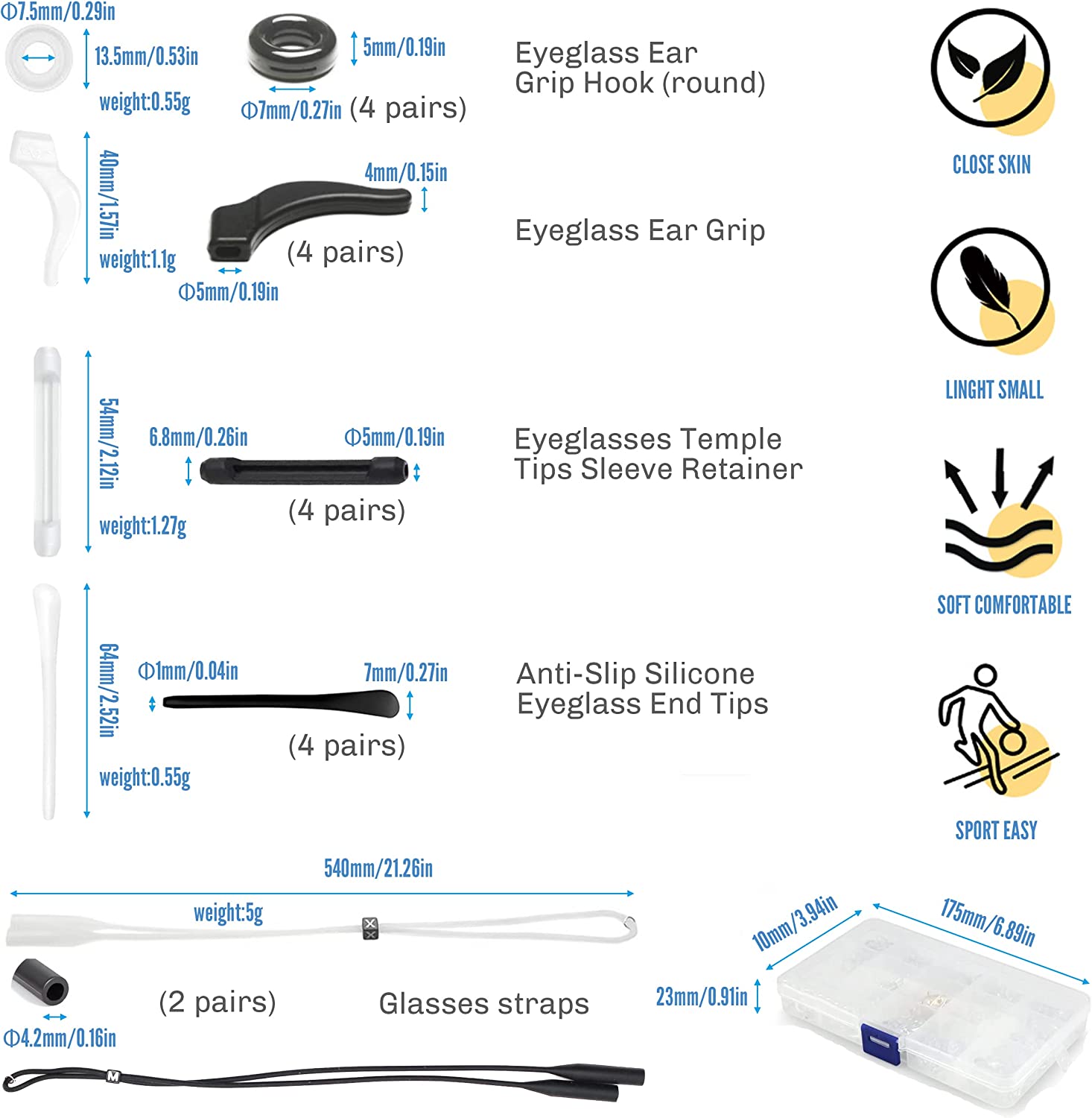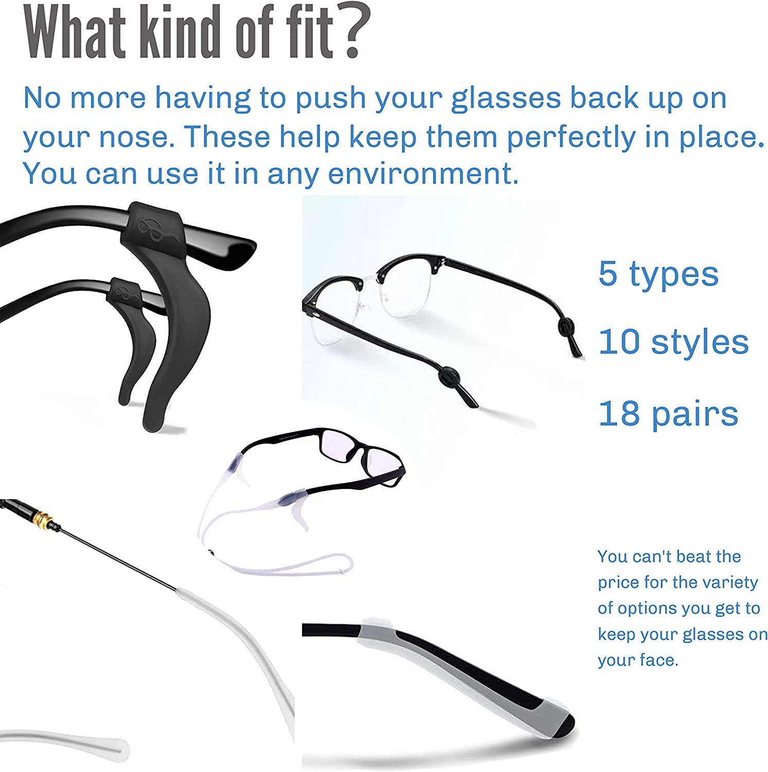 • Safety Eyewear Retainers:we have 6 types 10 styles 18 pairs 34pcs (black and white),2 pairs x Sports Glasses straps,4 pairs x Eyeglass Ear Grip Hook,4 pairs x Eyeglass Ear Grip Hook (round),4 pairs x Eyeglasses Temple Tips Sleeve Retainer,4 pairs x Anti-Slip Silicone Eyeglass End Tips