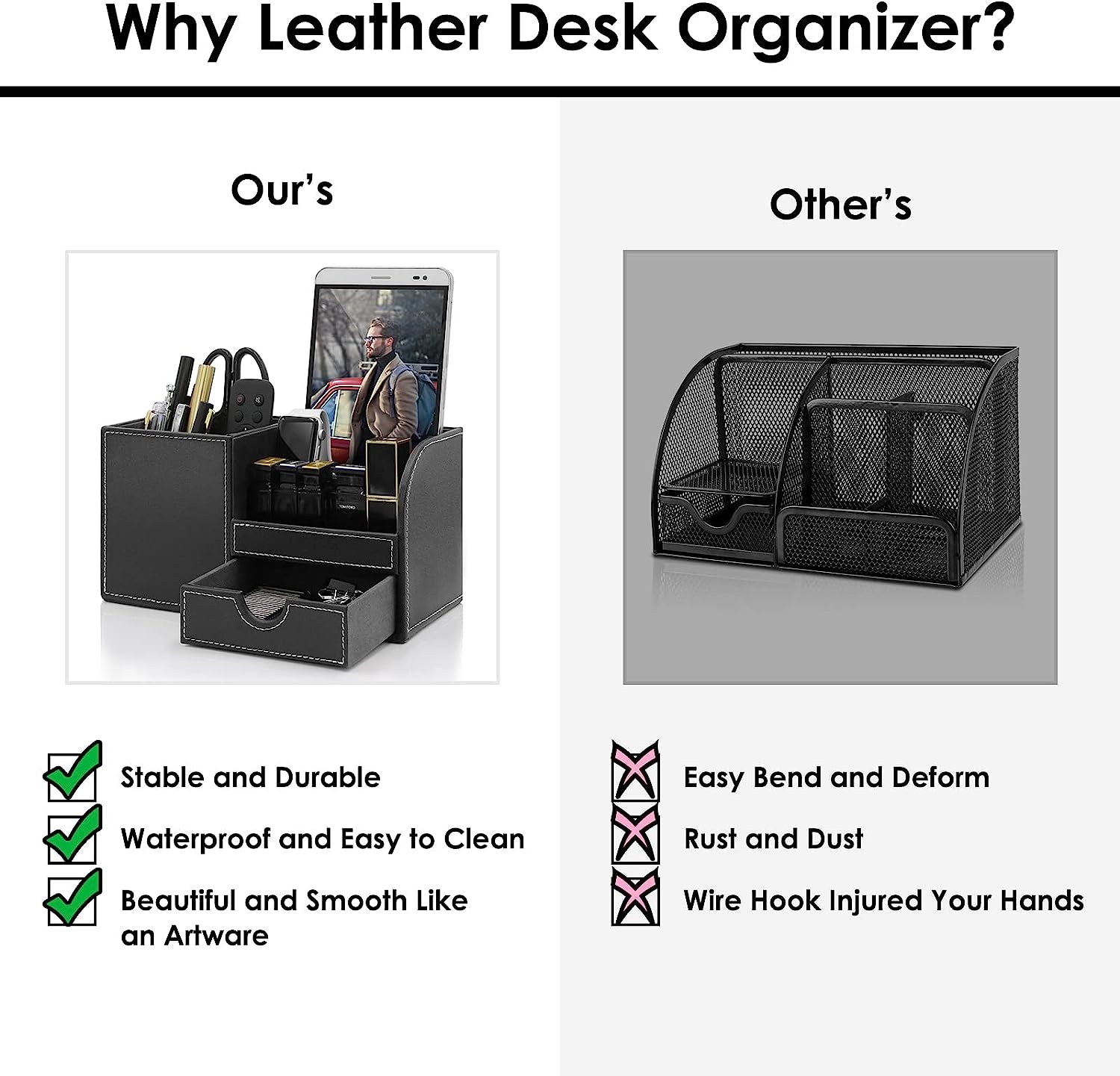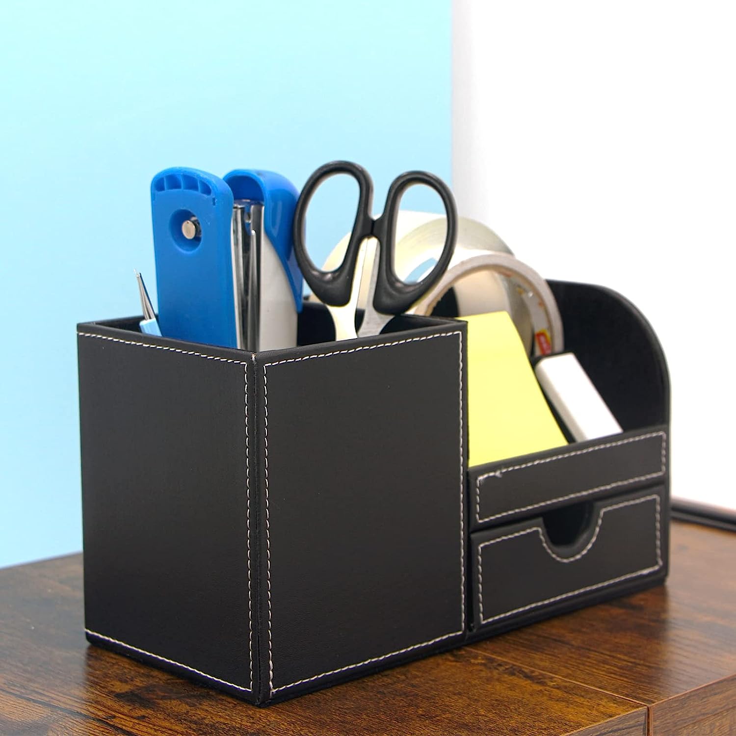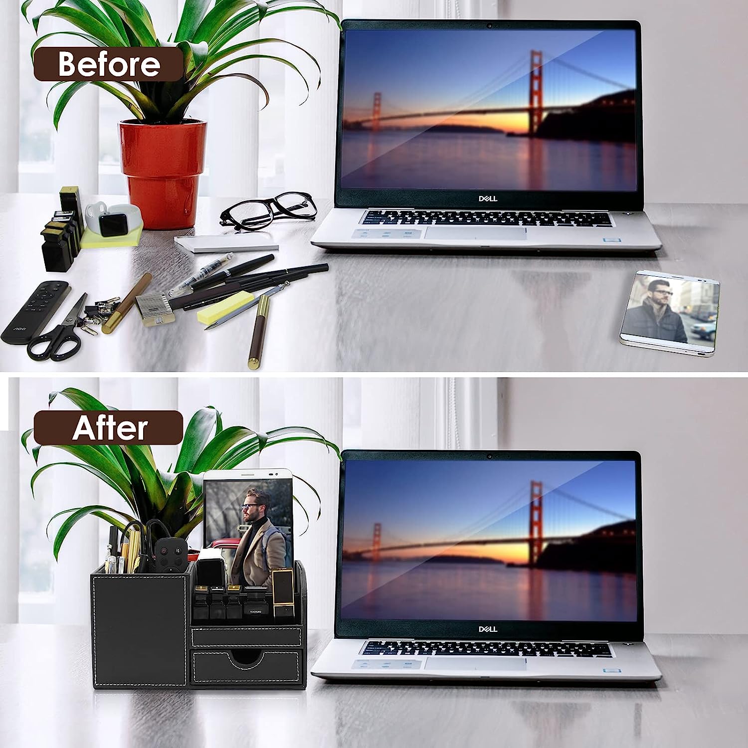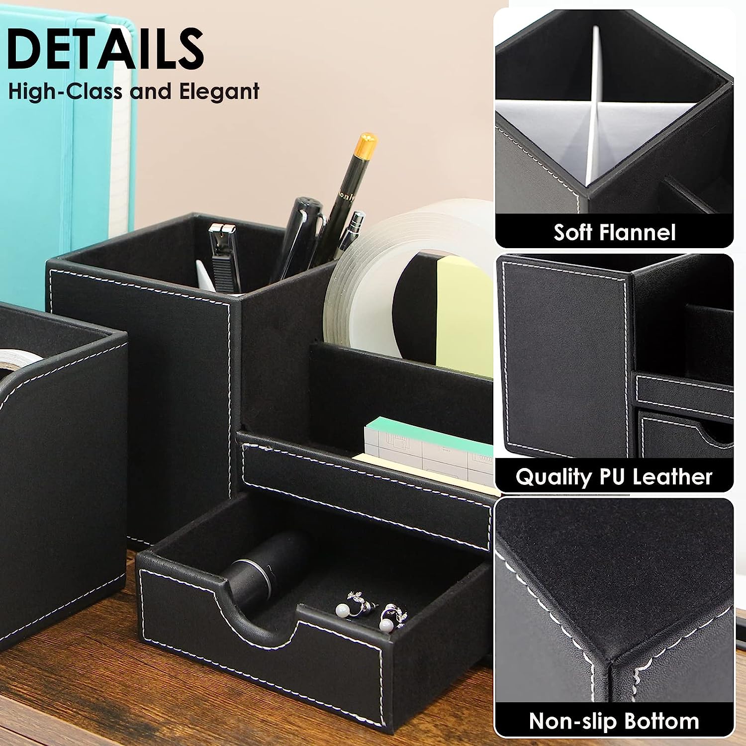 TooCust Leather Office Desk Organizer with Drawer, Multi-function Office Supplies for Desk Top Organizer,Black Mens Desk Accessories,Teacher Desk Organizer for Pen Pencil Holders and Organizers