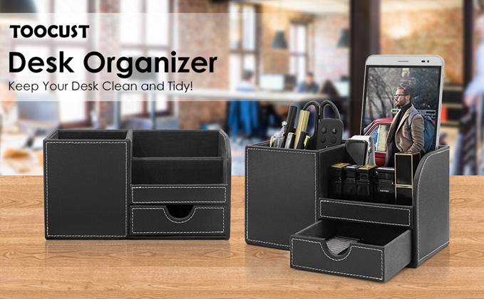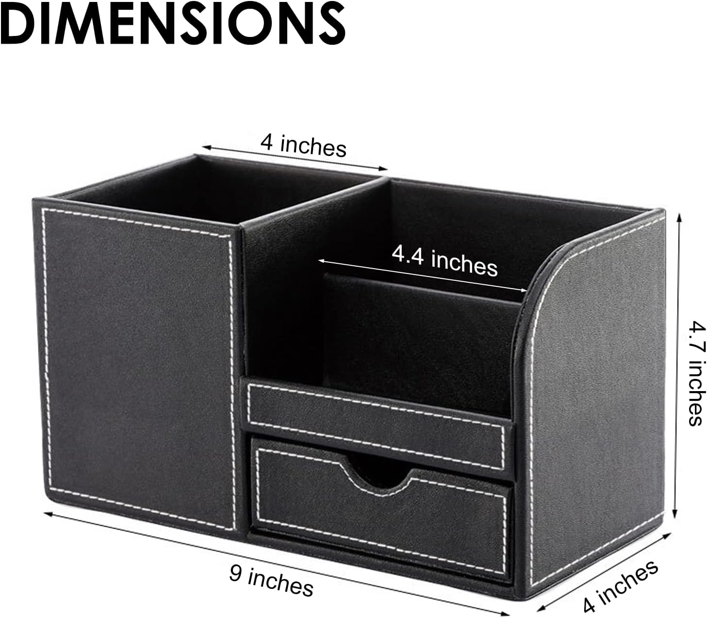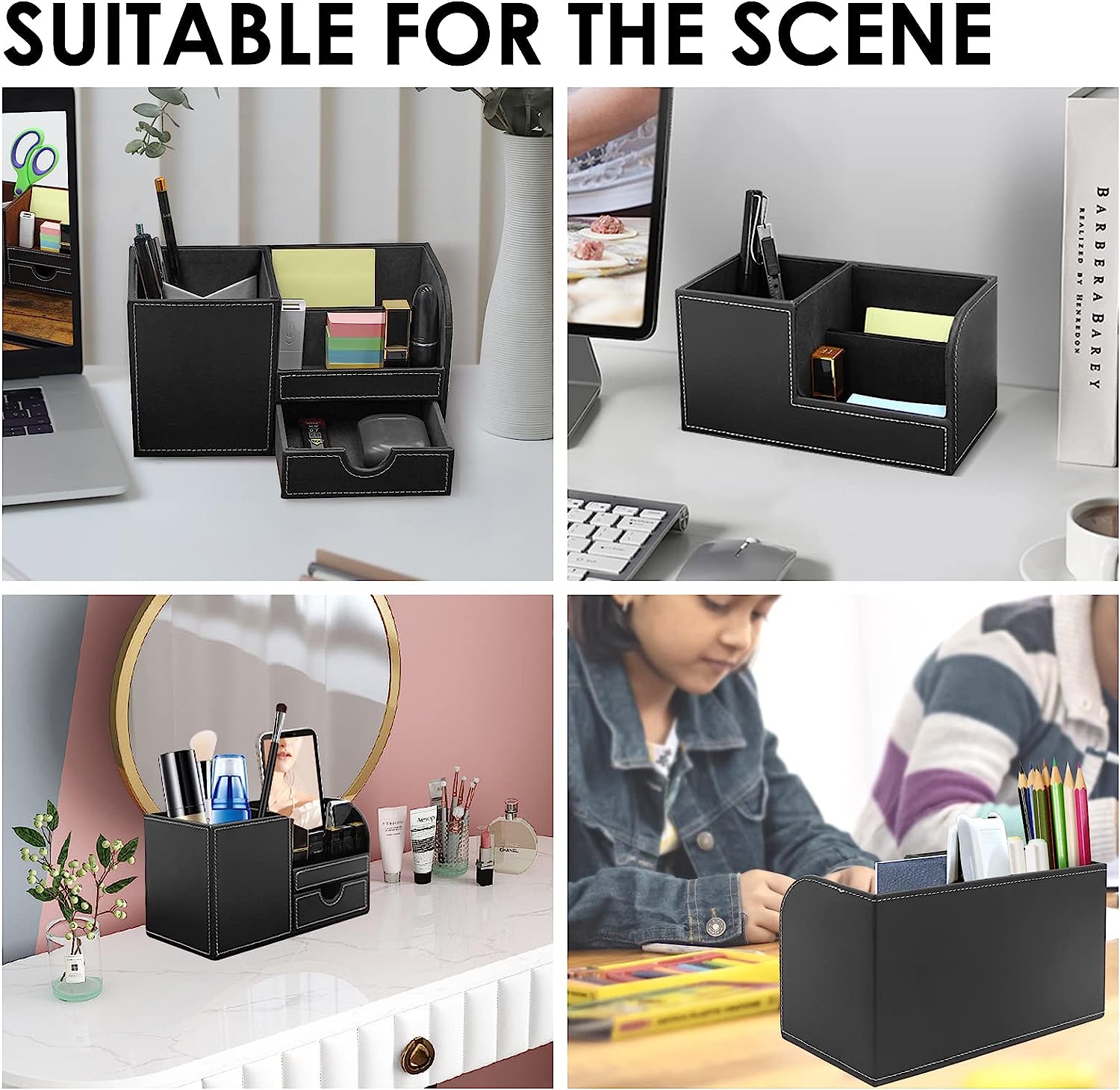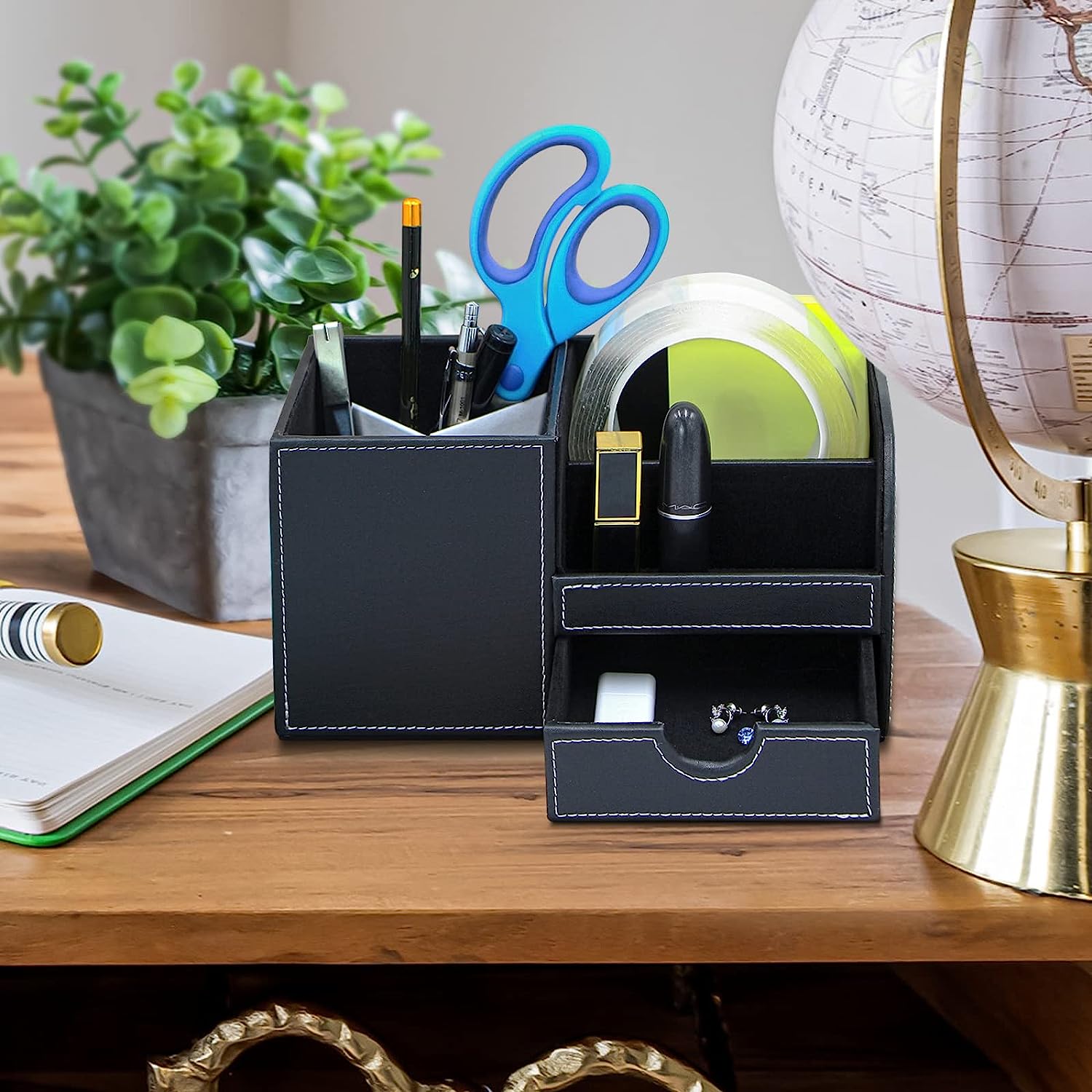 TooCust Leather Office Desk Organizer with Drawer, Multi-function Office Supplies for Desk Top Organizer,Black Mens Desk Accessories,Teacher Desk Organizer for Pen Pencil Holders and Organizers