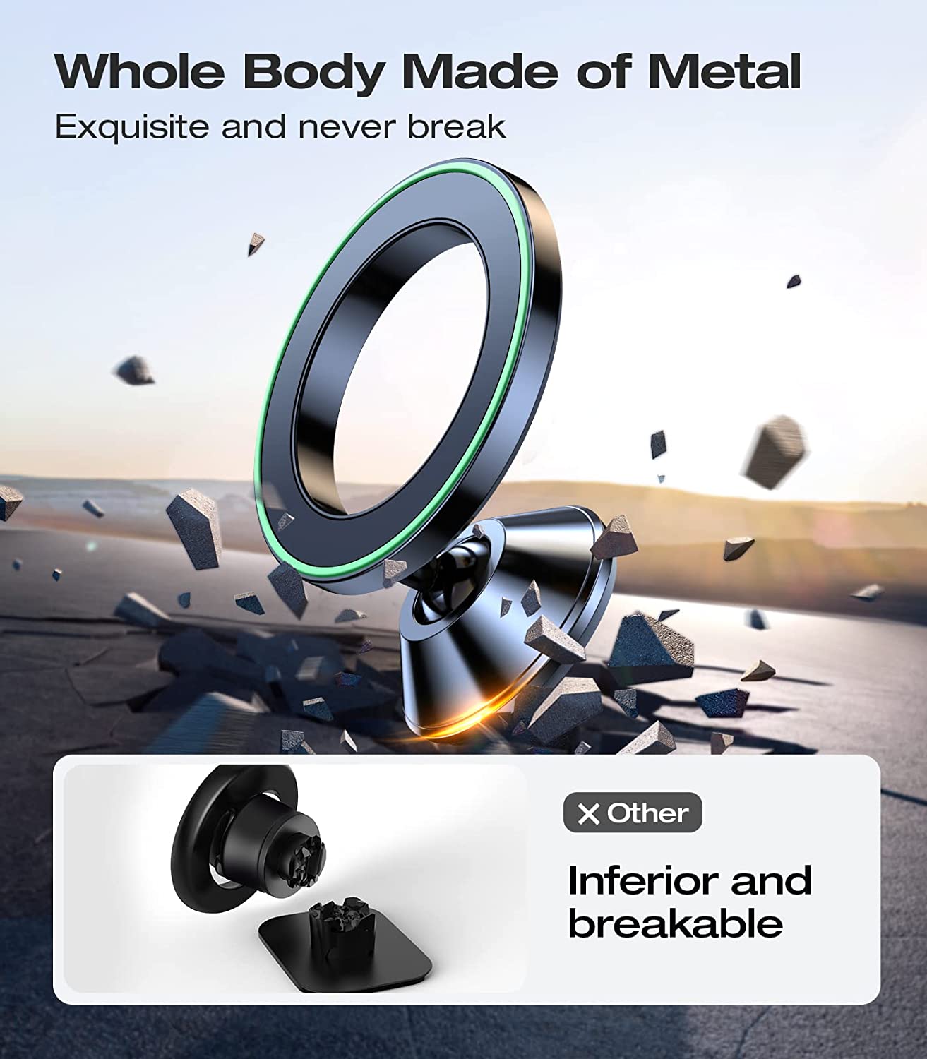 ?Small and 360° Flexible - As the lightest magnetic car cell phone holder on the market, you can install it anywhere. It doesn't take up space in your car or obstruct the view, easy adaptation into any car. The iphone magsafe car mount has a 360-degree omnidirectional adjustment ball joint, you can twist the magnetic ring panel to set the orientation of your phone arbitrarily, ensuring that your phone is always at the angle you like