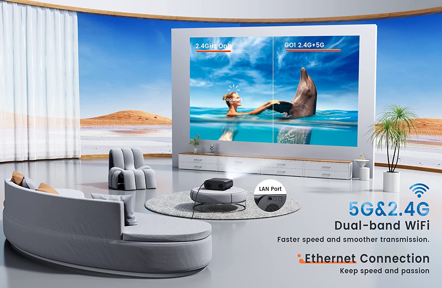 • ♥【5G+2.4G WiFi Projector & LAN Cable Connection】GO1 video projector equipped with 2.4G & 5G dual-band WiFi ensures both stability and speed. As the first projector on the market with Ethernet cable connectivity, it produces a more stable transmission. The network latency is reduced by 60% compared to other WiFi projectors, bringing a smoother watching experience like in the cinema. No lag playing the game and the passion stay! Entertainment gets easier and more varied with this home projector.