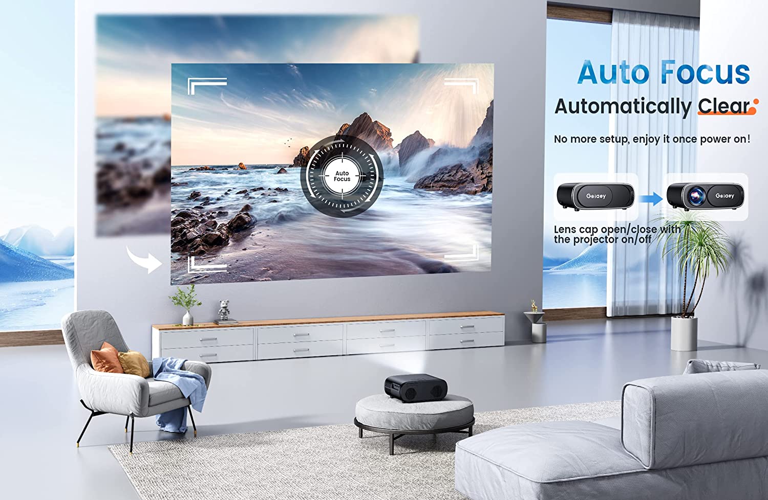 • ◎【Auto Focus & Electric Lens Cap & Dustproof】The first auto-focus LCD projector in 2022, GO1 portable projector adopts SLR focusing tech and a built-in AI camera. This smart projector will autofocus clearly in 5s as the power on or being moved. No need to manually adjust the focus or distance repeatedly like other projectors. The lens cap opens/closes with power on/off to protect the lens from dust and scratches, avoiding losing and allowing for easy maintenance, perfect for ceiling mounted!