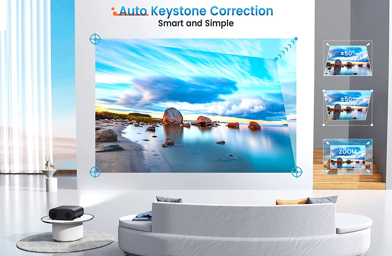 • ▆【Auto 6D Keystone + 4P Correction, Zoom Function】AI keystone correction with built-in sensor & 6-way gyroscope, when the projector moves, it will automatically recognize and adjust the screen to a rectangle! You can place the projector anywhere you want. 100%-50% zoom adapts well to different screen sizes without sacrificing image quality. No worry about space limits. This portable movie projector always provides you with crisp pictures. Share the 300" giant screen with your family and friends!