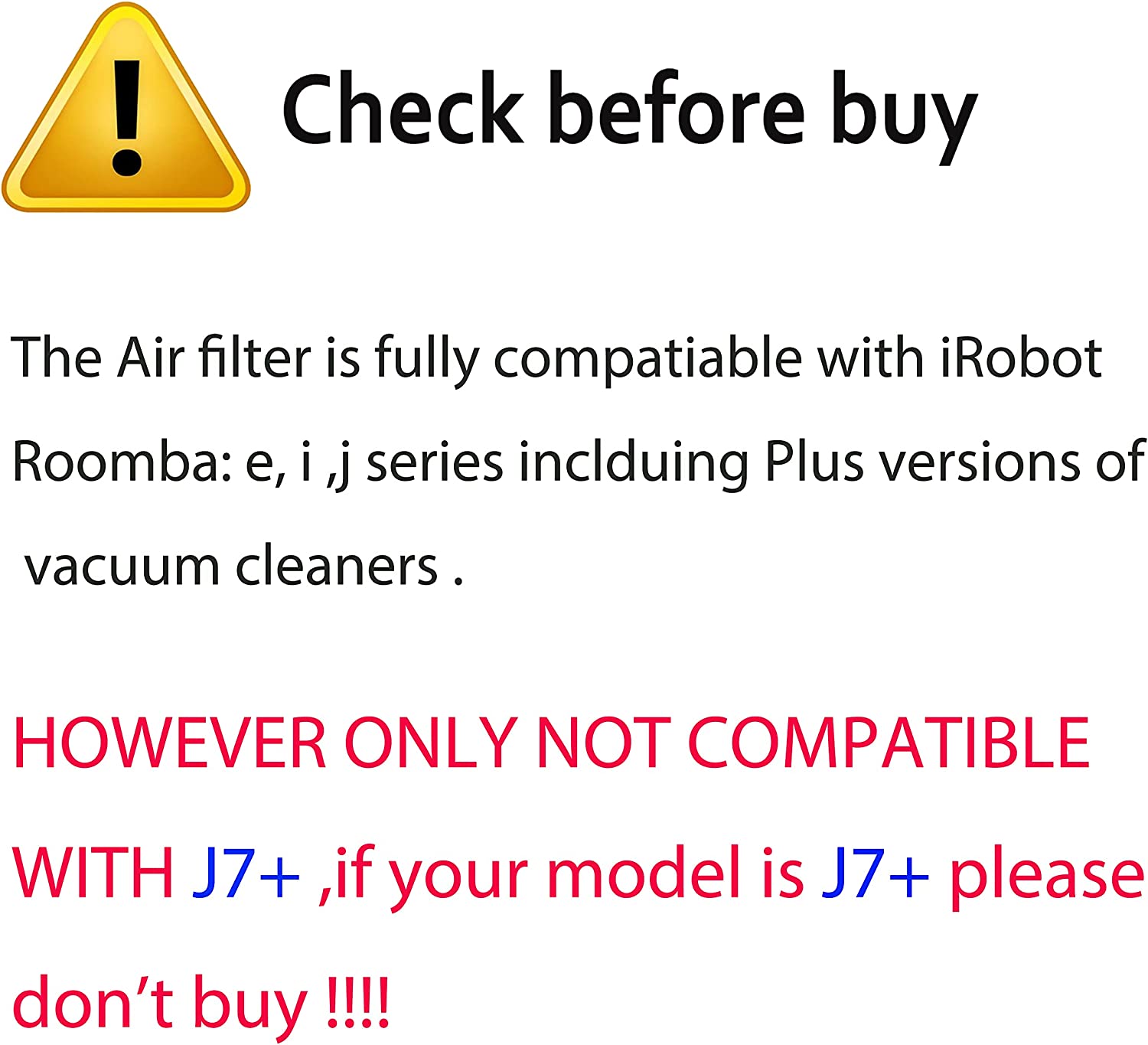 The High-Effiiciency Filters are Compatible with iRobot Roomba E series E5 (E5134) E6 (E6198) E7 I series i7(7150) i7+ i7 plus(7550) i1+(1552) i4+(4550 4552)i3+(3550) i6+(6550) i8+(8550) i2(2510) NOT FOR J7+ !!!